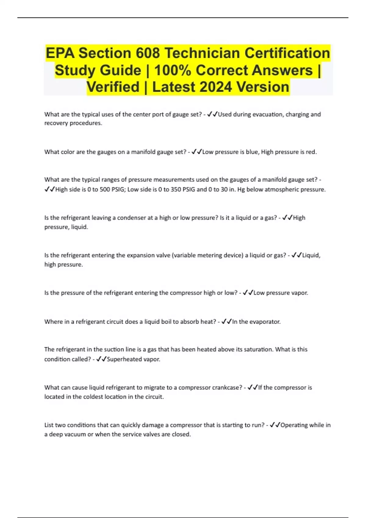 EPA Section 608 Technician Certification Study Guide | 100% Correct Answers | Verified | Latest 2024 Version What are the typical uses of the center port of gauge set? - Used during evacuation, charging and recovery procedures. What color are the gauges on a manifold gauge set? - Low pressure is blue, High pressure is red. What are the typical ranges of pressure measurements used on the gauges of a manifold gauge set? - High side is 0 to 500 PSIG; Low side is 0 to 350 PSIG and 0 to 30 in. Hg below atmospheric pressure. Is the refrigerant leaving a condenser at a high or low pressure? Is it a liquid or a gas? - High pressure, liquid. Is the refrigerant entering the expansion valve (variable metering device) a liquid or gas? - Liquid, high pressure. Is the pressure of the refrigerant entering the compressor high or low? - Low pressure vapor. Where in a refrigerant circuit does a liquid boil to absorb heat? - In the evaporator. The refrigerant in the suction line is a gas that has been heated above its saturation. What is this condition called? - Superheated vapor. What can cause liquid refrigerant to migrate to a compressor crankcase? - If the compressor is located in the coldest location in the circuit. List two conditions that can quickly damage a compressor that is starting to run? - Operating while in a deep vacuum or when the service valves are closed. What system failures require taking an oil sample? - A compressor burnout or if the unit has had a leak. Is flushing with refrigerant an acceptable tube cleaning method? - No. In addition to preventing and repairing leaks what else should a technician do to conserve refrigerant? - Recover and recycle used refrigerants. What factors affect the speed of an evacuation? - Pump size, hose length, hose diameter, size of system to be evacuated, ambient temperature, suction line size, and the amount of moisture in the system. How should gauge set hoses be sized for use in evacuating a system? - Use the shortest length and the largest diameter possible for the quickest evacuation. At least as large as the vacuum pump inlet. When evacuating what is the benefit of using short hoses with large diameters? - Reduces emissions, pressure drop and evacuation time. Which connection determines the preferred size of hoses used with a vacuum pump? - The vacuum pump inlet. As the capacity and suction hose size increase what happens to the time needed for an evacuation? - Time is reduced. What purpose is served by heating a system during dehydration? - To speed up moisture removal. Does a thorough evacuation remove moisture from a system? - Yes. What can happen to oil in the compressor if the moisture is left in an operating system? - The oil will form hydrofluoric and hydrochloric acids which will corrode the internal parts of the system. What is the result of over-evacuating a system? - No damage will be done. How can a system be leak checked using a low pressure gauge? - Vacuum reading will rise when vacuum pump is turned off. How close should the vacuum gauge be connected to the vacuum pump during evacuation? - As far away as possible. When measuring the vacuum of a system being evacuated the system must be isolated. What must be done to the vacuum pump? - Turn it off and valve it off. What is ozone? - 3 atoms of oxygen. It blocks much of the harmful ultraviolet radiation (uv-b) emitted from the sun and it keeps our earth's temperature stable. How much ozone can a chlorine atom destroy in the stratosphere? - One atom can destroy 100,000 ozone molecules. What is Ozone Depletion Potential (ODP)? - The ability of any chemical to deplete the ozone layer. What is CFC? - Chlorofluorocarbon. Which refrigerants are CFC's? - R-11,12,113,114. Which chemical in the CFC refrigerants does the most damage to the ozone layer? - Chlorine. What is an HCFC? - Hydrochlorofluorocarbons. Which refrigerants are HCFC's? - R-22,123. Which is more harmful to the ozone layer a