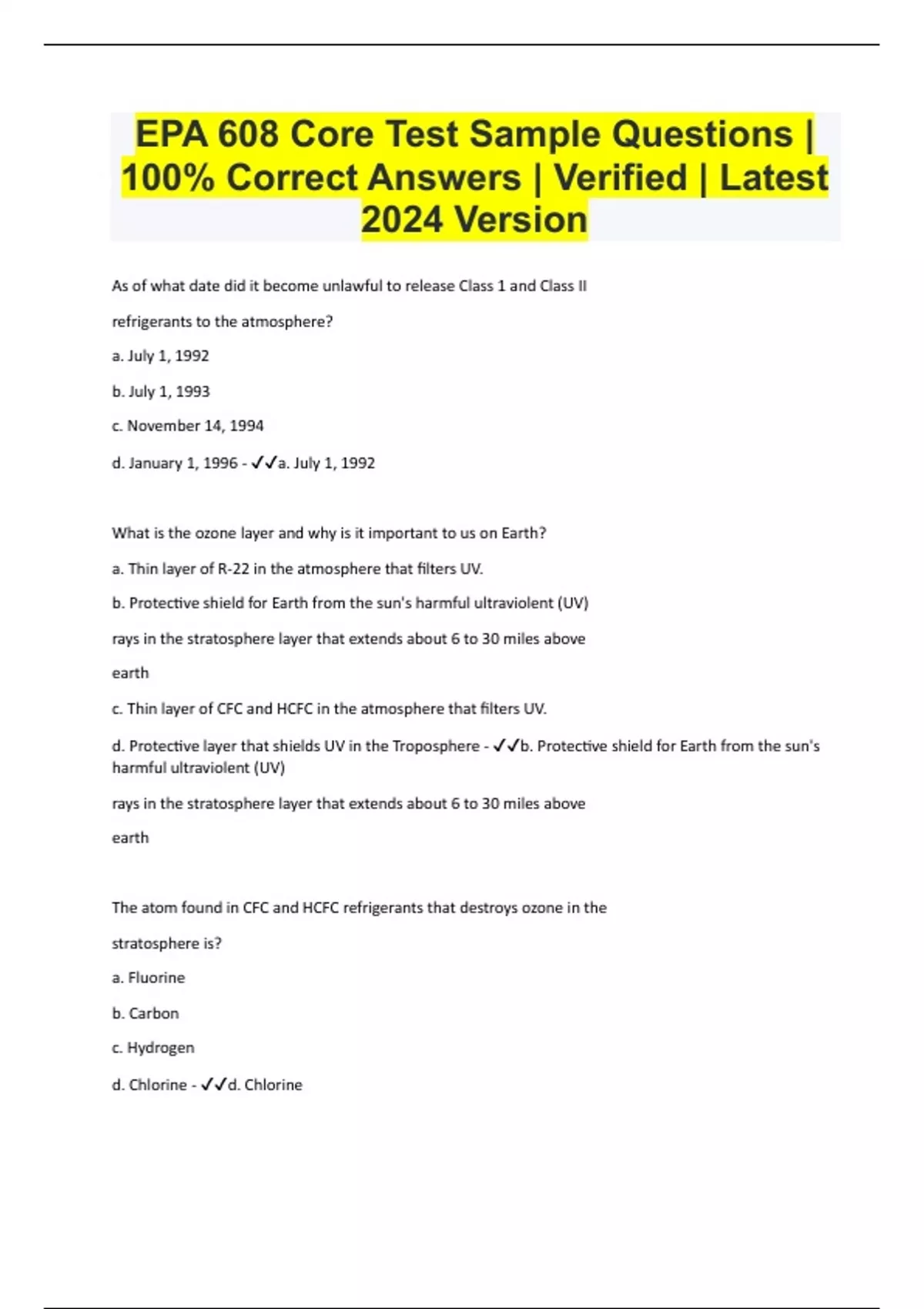 EPA 608 Core Test Sample Questions | 100% Correct Answers | Verified | Latest 2024 Version