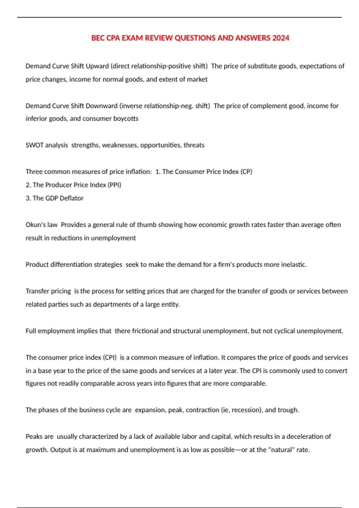 BEC CPA EXAM REVIEW QUESTIONS AND ANSWERS 2024 Demand Curve Shift Upward (direct relationship-positive shift) The price of substitute goods, expectations of price changes, income for normal goods, and extent of market Demand Curve Shift Downward (inverse relationship-neg. shift) The price of complement good, income for inferior goods, and consumer boycotts SWOT analysis strengths, weaknesses, opportunities, threats Three common measures of price inflation: 1. The Consumer Price Index (CP) 2. The Producer Price Index (PPI) 3. The GDP Deflator Okun's law Provides a general rule of thumb showing how economic growth rates faster than average often result in reductions in unemployment Product differentiation strategies seek to make the demand for a firm's products more inelastic. Transfer pricing is the process for setting prices that are charged for the transfer of goods or services between related parties such as departments of a large entity. Full employment implies that there frictional and structural unemployment, but not cyclical unemployment. The consumer price index (CPI) is a common measure of inflation. It compares the price of goods and services in a base year to the price of the same goods and services at a later year. The CPI is commonly used to convert figures not readily comparable across years into figures that are more comparable. The phases of the business cycle are expansion, peak, contraction (ie, recession), and trough. Peaks are usually characterized by a lack of available labor and capital, which results in a deceleration of growth. Output is at maximum and unemployment is as low as possible—or at the "natural" rate.