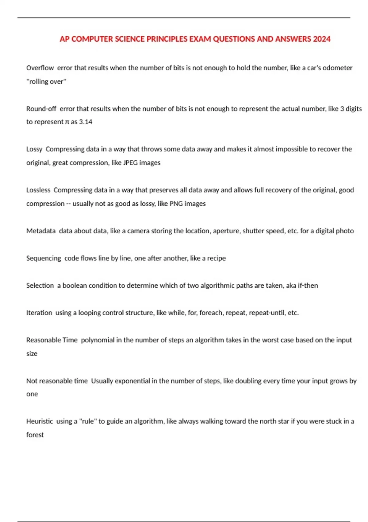 AP COMPUTER SCIENCE PRINCIPLES EXAM QUESTIONS AND ANSWERS 2024 Overflow error that results when the number of bits is not enough to hold the number, like a car's odometer "rolling over" Round-off error that results when the number of bits is not enough to represent the actual number, like 3 digits to represent π as 3.14 Lossy Compressing data in a way that throws some data away and makes it almost impossible to recover the original, great compression, like JPEG images Lossless Compressing data in a way that preserves all data away and allows full recovery of the original, good compression -- usually not as good as lossy, like PNG images Metadata data about data, like a camera storing the location, aperture, shutter speed, etc. for a digital photo Sequencing code flows line by line, one after another, like a recipe Selection a boolean condition to determine which of two algorithmic paths are taken, aka if-then Iteration using a looping control structure, like while, for, foreach, repeat, repeat-until, etc. Reasonable Time polynomial in the number of steps an algorithm takes in the worst case based on the input size Not reasonable time Usually exponential in the number of steps, like doubling every time your input grows by one Heuristic using a "rule" to guide an algorithm, like always walking toward the north star if you were stuck in a forest