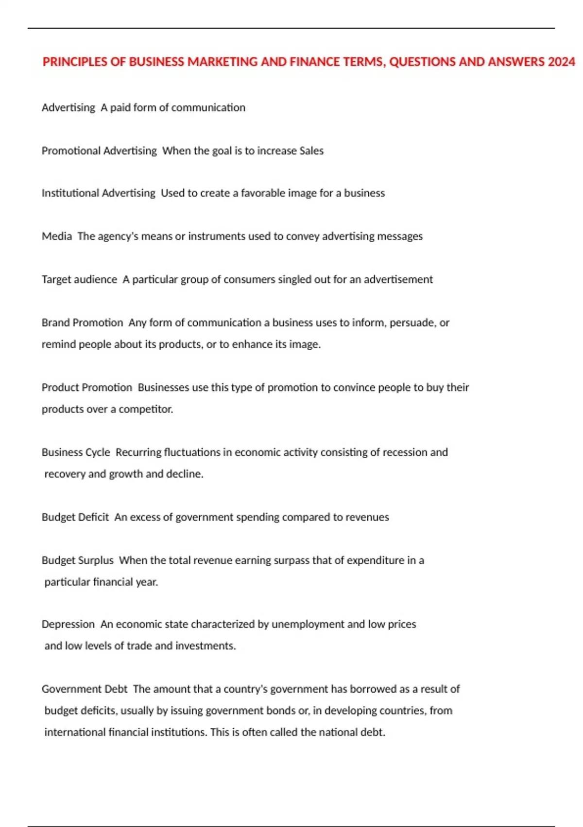 PRINCIPLES OF BUSINESS MARKETING AND FINANCE TERMS, QUESTIONS AND ANSWERS 2024 Advertising A paid form of communication Promotional Advertising When the goal is to increase Sales Institutional Advertising Used to create a favorable image for a business Media The agency's means or instruments used to convey advertising messages Target audience A particular group of consumers singled out for an advertisement Brand Promotion Any form of communication a business uses to inform, persuade, or remind people about its products, or to enhance its image. Product Promotion Businesses use this type of promotion to convince people to buy their products over a competitor. Business Cycle Recurring fluctuations in economic activity consisting of recession and recovery and growth and decline.