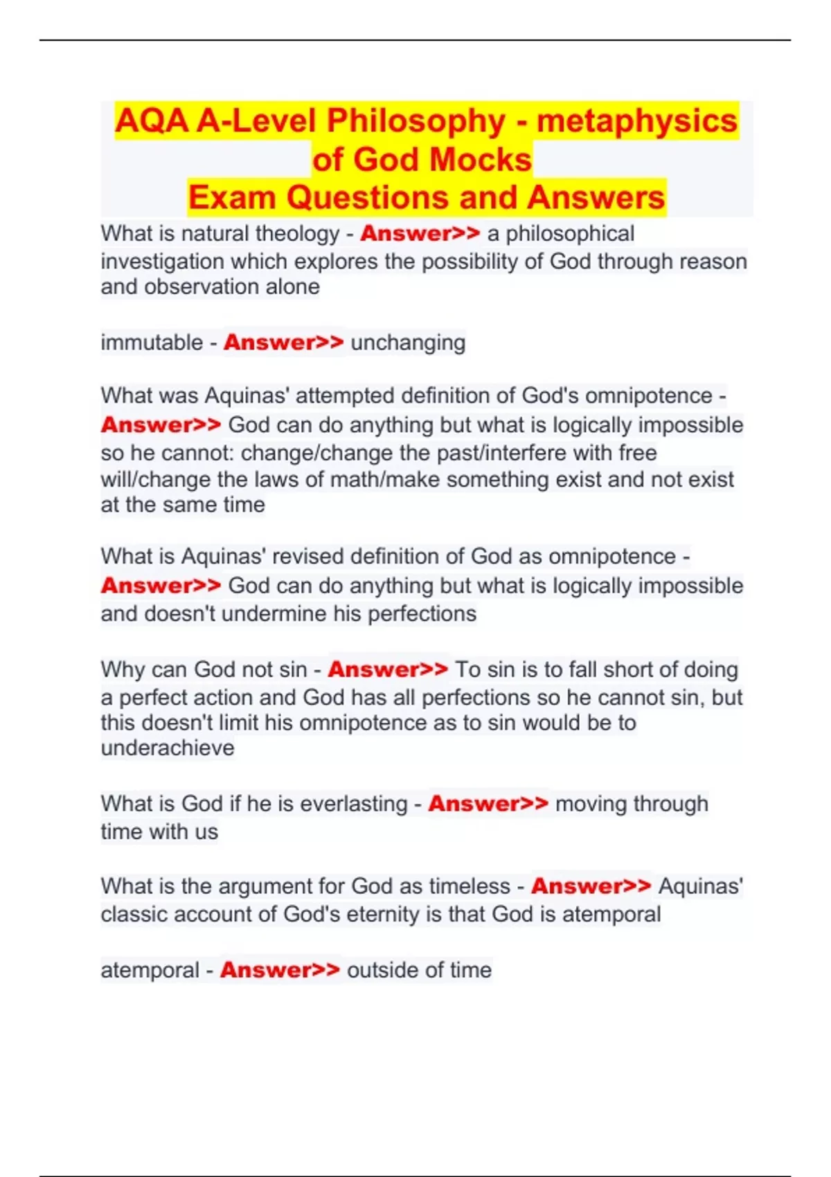 What is the argument for God as timeless - Answer>> Aquinas'