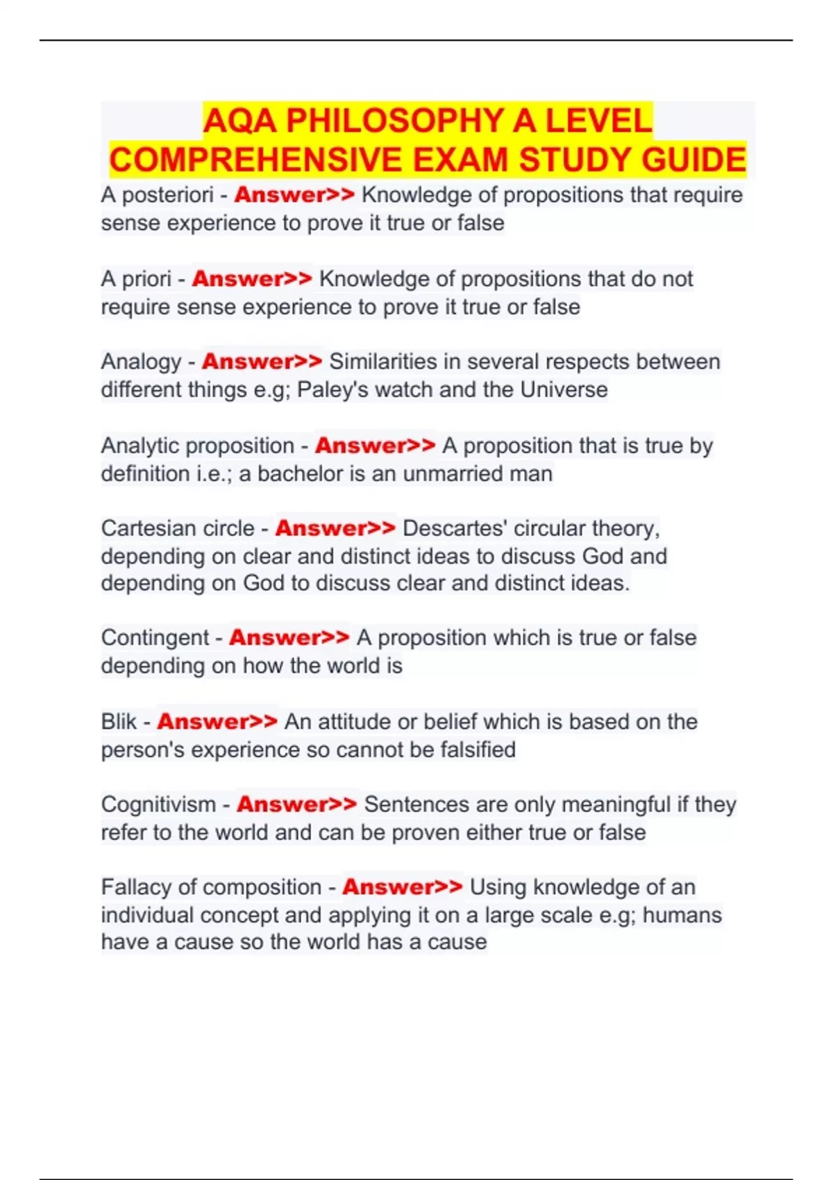 A priori - Answer>> Knowledge of propositions that do not