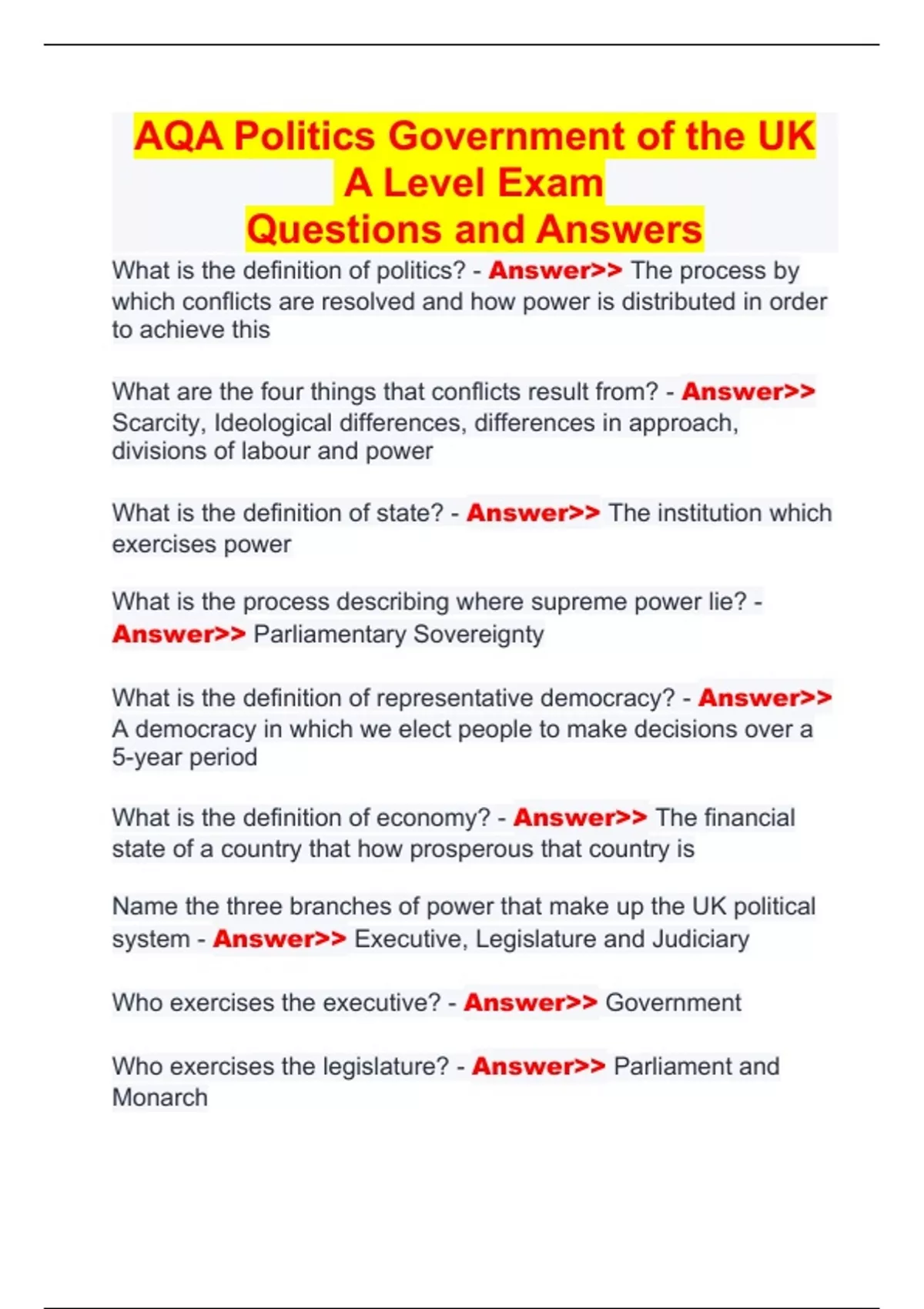 AQA Politics Government of the UK A Level Exam Questions and Answers
