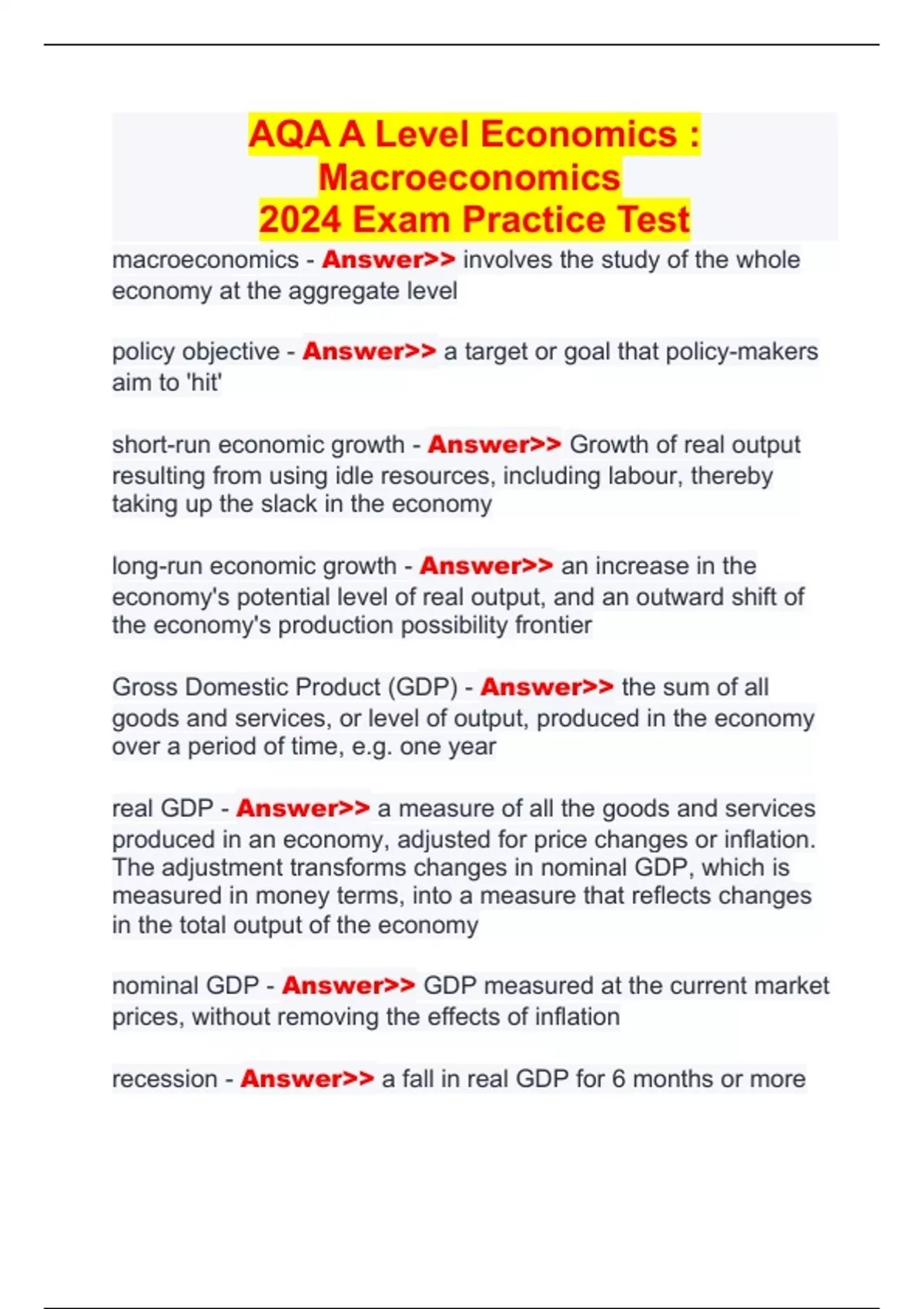 AQA A Level Economics : Macroeconomics 2024 Exam Practice Test