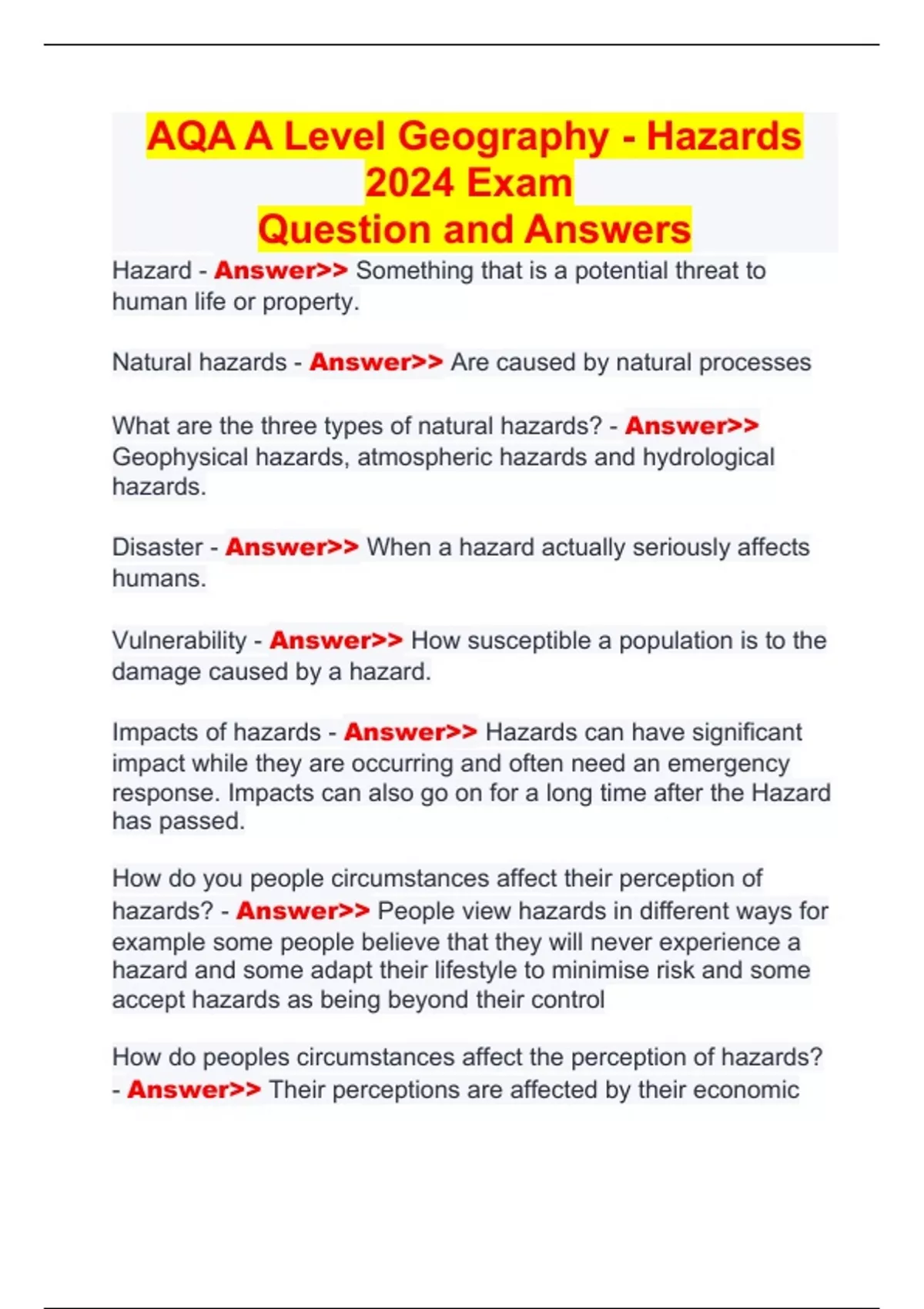 AQA A Level Geography - Hazards 2024 Exam Question and Answers