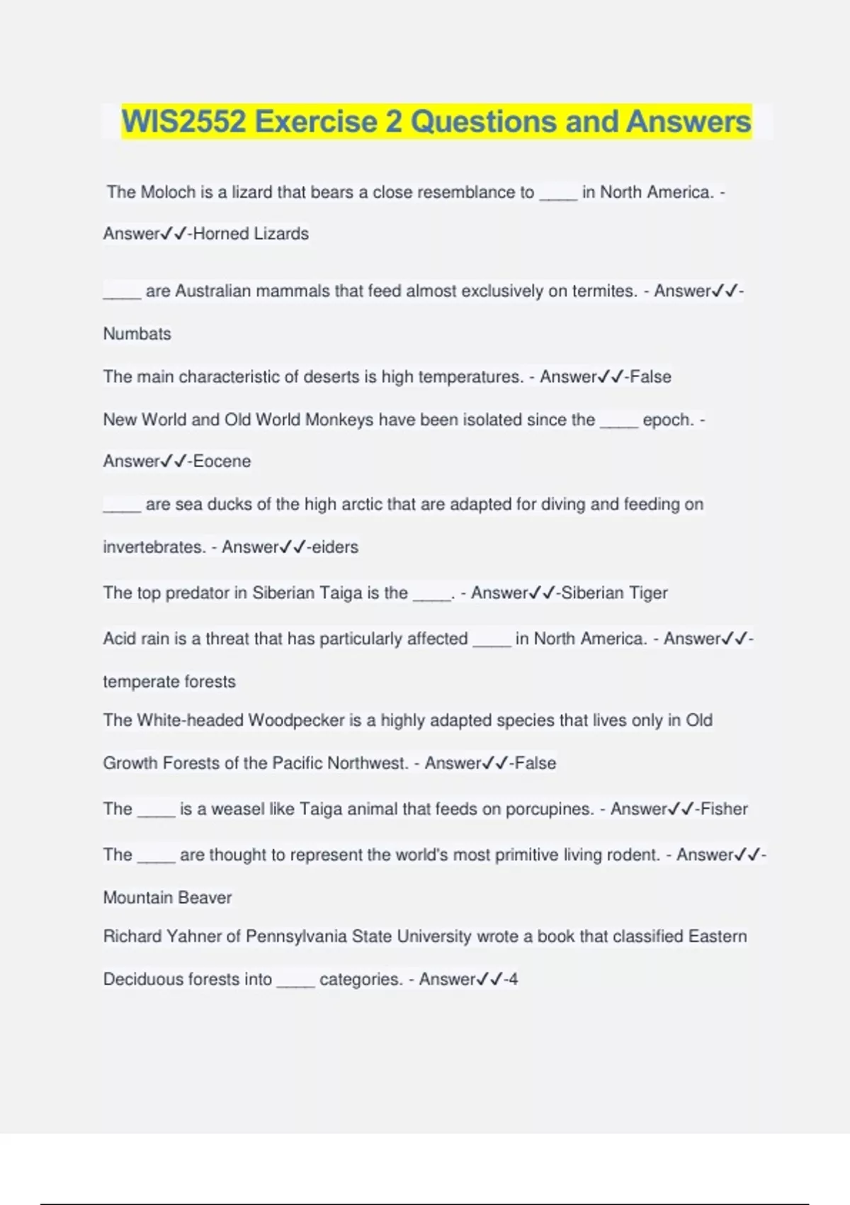 WIS2552 Exercise 2 Questions and Answers The Moloch is a lizard that bears a close resemblance to ____ in North America. - Answer️️ -Horned Lizards ____ are Australian mammals that feed almost exclusively on termites. - Answer️️ - Numbats The main characteristic of deserts is high temperatures. - Answer️️ -False New World and Old World Monkeys have been isolated since the ____ epoch. - Answer️️ -Eocene ____ are sea ducks of the high arctic that are adapted for diving and feeding on invertebrates. - Answer️️ -eiders The top predator in Siberian Taiga is the ____. - Answer️️ -Siberian Tiger Acid rain is a threat that has particularly affected ____ in North America. - Answer️️ - temperate forests The White-headed Woodpecker is a highly adapted species that lives only in Old Growth Forests of the Pacific Northwest. - Answer️️ -False The ____ is a weasel like Taiga animal that feeds on porcupines. - Answer️️ -Fisher The ____ are thought to represent the world's most primitive living rodent. - Answer️️ - Mountain Beaver Richard Yahner of Pennsylvania State University wrote a book that classified Eastern Deciduous forests into ____ categories. - Answer️️ -4 ____ are insectivorous mammals with very high metabolic rates that are found in Eastern Deciduous Forest of North America. - Answer️️ -shrews The invention of ____ around 1870 had a major effect on land use patterns in the Great Plains. - Answer️️ -barbed wire ____ are extensions on the trunk of some tropical trees that supports them in shallow soils. - Answer️️ -Buttresses The ____ is the basic form of photosynthesis. - Answer️️ -Calvin Cycle ____ are arboreal foliovores of the Australian temperate forests. - Answer️️ -Koalas The so-called Dust Bowl of the early twentieth century was the result of ____. - Answer️️ -poor farming practices As an example of convergent evolution, Ichthyosaurs resemble ____. - Answer️️ - sharks Across the tundra, the annual rainfall averages ____ per year. - Answer️️ - 25 cm Old and New World monkeys differ especially in the structure of the ____. - Answer️️ - nose As an adaptation to reflect sunlight, the Arabian Oryx has ____. - Answer️️ -pale fur The ____ appears to be a species that is declining due to protection of forests from succession. - Answer️️ -Rufous-sided Towhee ____ are a species that is causing widespre