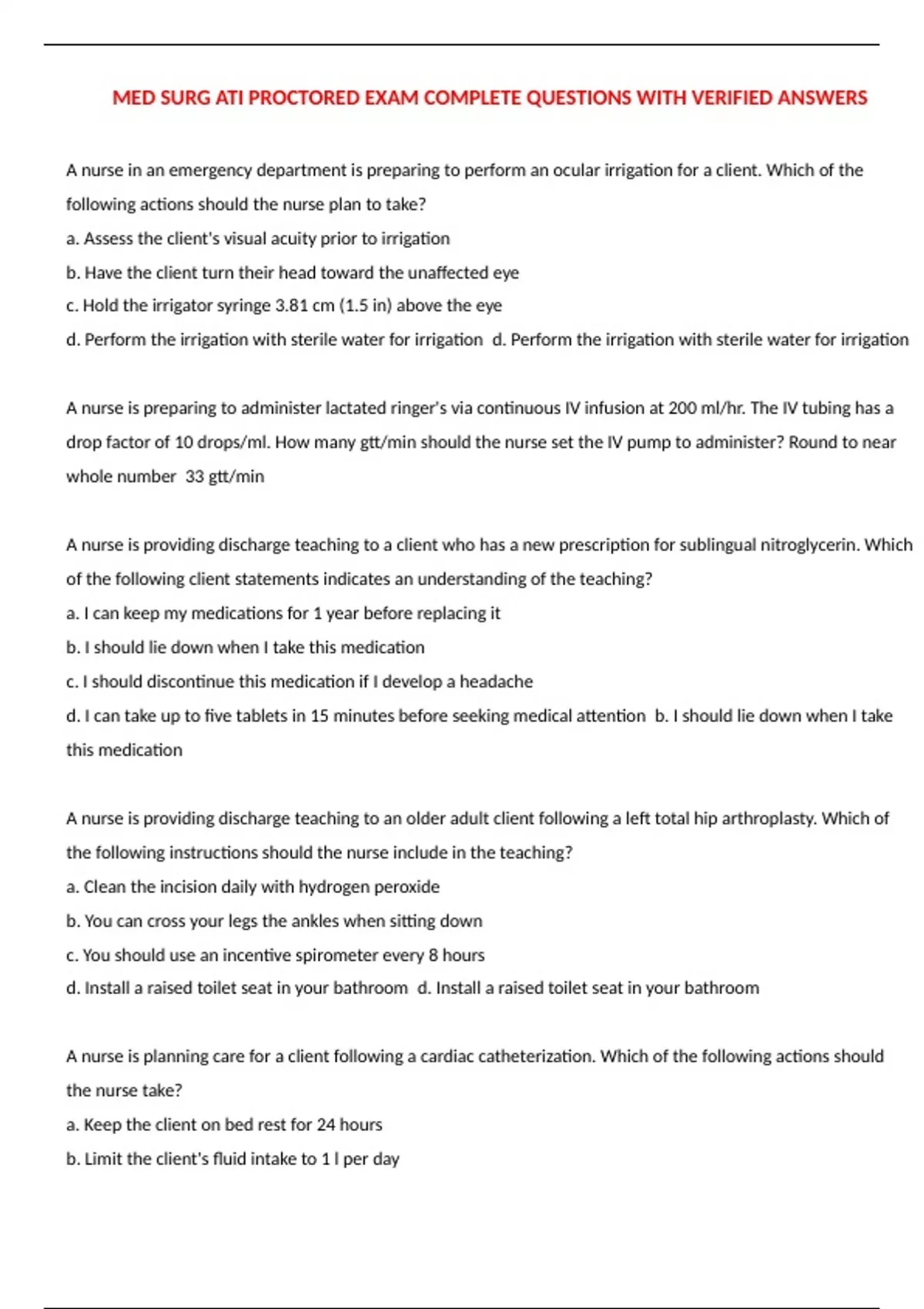 MED SURG ATI PROCTORED EXAM COMPLETE QUESTIONS WITH VERIFIED ANSWERS A nurse in an emergency department is preparing to perform an ocular irrigation for a client. Which of the following actions should the nurse plan to take? a. Assess the client's visual acuity prior to irrigation b. Have the client turn their head toward the unaffected eye c. Hold the irrigator syringe 3.81 cm (1.5 in) above the eye d. Perform the irrigation with sterile water for irrigation d. Perform the irrigation with sterile water for irrigation A nurse is preparing to administer lactated ringer's via continuous IV infusion at 200 ml/hr. The IV tubing has a drop factor of 10 drops/ml. How many gtt/min should the nurse set the IV pump to administer? Round to near whole number 33 gtt/min A nurse is providing discharge teaching to a client who has a new prescription for sublingual nitroglycerin. Which of the following client statements indicates an understanding of the teaching? a. I can keep my medications for 1 year before replacing it b. I should lie down when I take this medication c. I should discontinue this medication if I develop a headache d. I can take up to five tablets in 15 minutes before seeking medical attention b. I should lie down when I take this medication A nurse is providing discharge teaching to an older adult client following a left total hip arthroplasty. Which of the following instructions should the nurse include in the teaching? a. Clean the incision daily with hydrogen peroxide b. You can cross your legs the ankles when sitting down c. You should use an incentive spirometer every 8 hours d. Install a raised toilet seat in your bathroom d. Install a raised toilet seat in your bathroom A nurse is planning care for a client following a cardiac catheterization. Which of the following actions should the nurse take? a. Keep the client on bed rest for 24 hours b. Limit the client's fluid intake to 1 l per day c. Maintain the client's affected extremity in extension d. Change the client's dressing every 8 hour c. Maintain the client's affected extremity in extension A nurse is caring for a client who has a lower extremity fracture and a prescription for crutches. Which of the following client statements indicates that the client is adapting to their role change? a. I will need to have my partner take over shopping for groceries and cooking the meals for us b. These crutches will make it impossible to care for my child c. I feel bad that I have to ask my partner to keep the house clean d. Its going to be difficult to tell my parents I cant take them to their appointments anymore a. I will need to have my partner take over shopping for groceries and cooking the meals for us A nurse is caring for a client who has gastroenteritis. Which of the following assessment findings should the nurse recognize as an indication that the client is experiencing dehydration? a. Pitting, dependent edema b. Distended jugular veins c. Increased BP d. Decreased BP d. Decreased BP A nurse is caring for a client who has a contusion of the brainstem and reports thirst. The client's urinary output was 4,000 ml over the past 24 hour. The nurse should anticipate a prescription for which of the following IV medication? a. Desmopressin b. Epinephrine c. Furosemide d. Nitroprusside a. Desmopressin