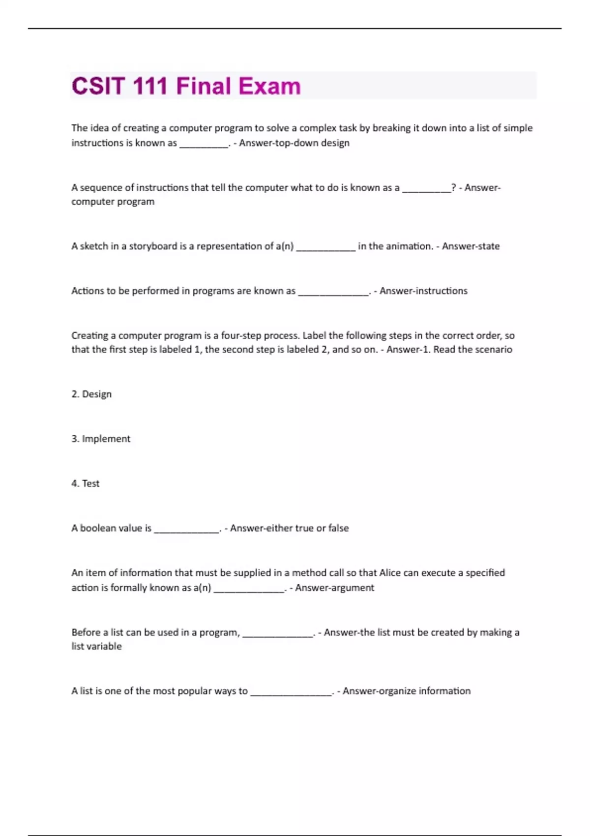 The idea of creating a computer program to solve a complex task by breaking it down into a list of simple instructions is known as _________. - Answer-top-down design A sequence of instructions that tell the computer what to do is known as a _________? - Answercomputer program A sketch in a storyboard is a representation of a(n) ___________ in the animation. - Answer-state Actions to be performed in programs are known as _____________. - Answer-instructions Creating a computer program is a four-step process. Label the following steps in the correct order, so that the first step is labeled 1, the second step is labeled 2, and so on. - Answer-1. Read the scenario 2. Design 3. Implement 4. Test A boolean value is ____________. - Answer-either true or false An item of information that must be supplied in a method call so that Alice can execute a specified action is formally known as a(n) _____________. - Answer-argument Before a list can be used in a program, _____________. - Answer-the list must be created by making a list variable A list is one of the most popular ways to _______________. - Answer-organize informationSelect all applicable answers. Iteration through a list is sometimes called __________ a list. - Answertraversing, walking What is a billboard in Alice? - Answer-a 2D image added to a virtual world A list search would most likely involve which control structures? - Answer-for all in order, if A(n) __________ is a common list operation used in programming. Its purpose is to iterate through a list of items, one item at a time, and check each one to see if it has exactly what we are looking for. - Answer-list search In programming, an organizing structure is referred to as a(n) ___________. - Answer-data structure To "iterate through a list" means to ______________. - Answer-do the same thing for all the items in a list Comments are NOT a basic part of writing a computer program, only the code is essential. - Answer-False An instruction is composed of _____________. - Answer-a method name and potentially multiple arguments Conditional execution and repetition in a program are implemented by using programming statements known as control structures. - Answer-True When parameters are used in event-driven programming, it is especially important to run the animation several times, each time with different possible parameter values, to determine that it works as expected. - Answer-True A penguin, tortoise, hare, tree, and beach ball exist in the following Alice world. The penguin's class-level methods perform the expected actions their names suggest. True or false: if the following Alice world is run, and the user clicks on the tree, the penguin will walk towards the tree. - Answer-FalseIt is illegal to program a recursive function. - Answer-False An If statement is absolutely necessary in any method which implements repetition through recursion. - Answer-False How many times does the penguin jump when the below code is run? - Answer-4 Times The keyword ________ signals the presence of looping. - Answer-WHILE A loop can execute only a whole number of times. - Answer-True