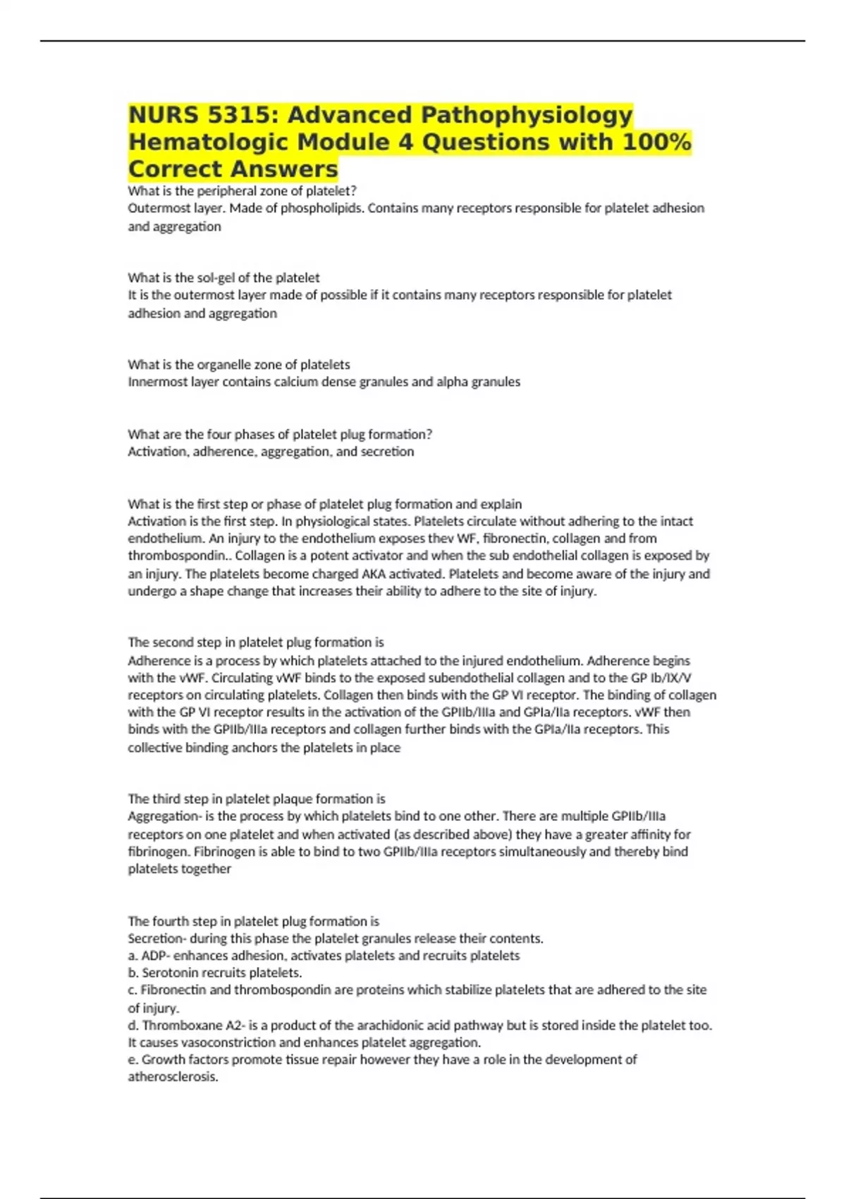NURS 5315: Advanced Pathophysiology Hematologic Module 4 Questions with 100% Correct Answers What is the peripheral zone of platelet? Outermost layer. Made of phospholipids. Contains many receptors responsible for platelet adhesion and aggregation What is the sol-gel of the platelet It is the outermost layer made of possible if it contains many receptors responsible for platelet adhesion and aggregation What is the organelle zone of platelets Innermost layer contains calcium dense granules and alpha granules What are the four phases of platelet plug formation? Activation, adherence, aggregation, and secretion What is the first step or phase of platelet plug formation and explain Activation is the first step. In physiological states. Platelets circulate without adhering to the intact endothelium. An injury to the endothelium exposes thev WF, fibronectin, collagen and from thrombospondin.. Collagen is a potent activator and when the sub endothelial collagen is exposed by an injury. The platelets become charged AKA activated. Platelets and become aware of the injury and undergo a shape change that increases their ability to adhere to the site of injury. The second step in platelet plug formation is Adherence is a process by which platelets attached to the injured endothelium. Adherence begins with the vWF. Circulating vWF binds to the exposed subendothelial collagen and to the GP Ib/IX/V receptors on circulating platelets. Collagen then binds with the GP VI receptor. The binding of collagen with the GP VI receptor results in the activation of the GPIIb/IIIa and GPIa/IIa receptors. vWF then binds with the GPIIb/IIIa receptors and collagen further binds with the GPIa/IIa receptors. This collective binding anchors the platelets in place The third step in platelet plaque formation is Aggregation- is the process by which platelets bind to one other. There are multiple GPIIb/IIIa receptors on one platelet and when activated (as described above) they have a greater affinity for fibrinogen. Fibrinogen is able to bind to two GPIIb/IIIa receptors simultaneously and thereby bind platelets together The fourth step in platelet plug formation is Secretion- during this phase the platelet granules release their contents. a. ADP- enhances adhesion, activates platelets and recruits platelets b. Serotonin recruits platelets. c. Fibronectin and thrombospondin are proteins which stabilize platelets that are adhered to the site of injury. d. Thromboxane A2- is a product of the arachidonic acid pathway but is stored inside the platelet too. It causes vasoconstriction and enhances platelet aggregation. e. Growth factors promote tissue repair however they have a role in the development of atherosclerosis. The final step in platelet plug formation The platelet plug is stabilized by fibrin and XIIIa which are the end products of the coagulation cascade. What is the extrinsic pathway arms of the coagulation cascade Extrinsic pathway is considered the primary pathway of coagulation. It is activated when Tissue Factor is exposed at the site of injury. The process starts with a vascular injury which results in the exposure of Tissue Factor (III) which has a cell receptor for factor VII. (As a side note lipid filled macrophages in atherosclerotic plaques contain a large amount of tissue factor which increases the likelihood of arterial thrombus formation from plaque ruptures). Once exposed TF binds with VII to form the TF/VIIa complex. TF/VIIa activates X = Xa. Activated factor Xa binds with activated Va and calcium to form the prothrombinase complex. The prothrombinase complex converts factor II (prothrombin) to activated factor IIa (thrombin). Thrombin (activated factor IIa) then moves on to activate 4 factors. It activates factor I (fibrinogen) to activated factor Ia (fibrin) and it also activates factors V, VIII & XIII. You can see the action of thrombin on your screen marked with blue lines. Fibrin (activated factor Ia) is placed over the platelet plug and activated factor XIIIa stabilizes the fibrin. What is the intrinsic pathway arms of the coagulation cascade The clinical significance of the intrinsic pathway is not entirely understood, because a deficiency of factor XII (Hageman factor) does not cause bleeding. As such the intrinsic pathway's main function is thought to be one which enhances the extrinsic pathway. This pathway is activated when the blood is exposed to negative charges which are found on the molecules of ADP and ATP. This exposure activates factor XII (Hageman factor). Activated factor XIIa then activates factor XI. Activated factor XIa activates IX. Activated factor IXa then activates factor X. Activated factor Xa then forms the prothrombinase complex in the common pathway. Coagulation Cascade Key Plasma Proteins 1.Tissue Factor 2.VII 3.X 4 .Prothrombinase Complex 5. Prothrombin 6. Thrombin 7 .Fibrinogen 8. Fibrin 9. XIII 10. XII 11. VIII 12. IX 13. Antithrombin 14. Protein C 15. Protein S 16.t-PA 1. Initiator of extrinsic pathway. 2. Forms complex with tissue factor (III) and activates factors IX and X 3. Activates Prothrombin through activated Xa form 4. (prothrombin and activated factors X and V) that activates prothrombin into thrombin 5. Factor II, source of thrombin that activates fibrinogen 6. cleaves the extracellular domain of G-protein-coupled protease-activated receptors (PARs), thereby initiating transmembrane signaling. 7. moves between the beta and gamma regions but is removed during the formation of serum; precursor of fibrin clot 8. Used to stabilize clot 9. Fibrin - stabilizing factor - cross links fibrin through XIIIa to strengthen clot 10. Hageman Factor. Initiator of intrinsic pathway 11. VIIIa is a component of tenase complex 12. IXa is a component of tenase complex, activates factor X 13. it inhibits thrombin and several activated clotting factors (e.g., VIIa, IXa, Xa, XIa, XIIa). 14. in the circulation binds to thrombomodulin in a thrombin-dependent manner and is converted 