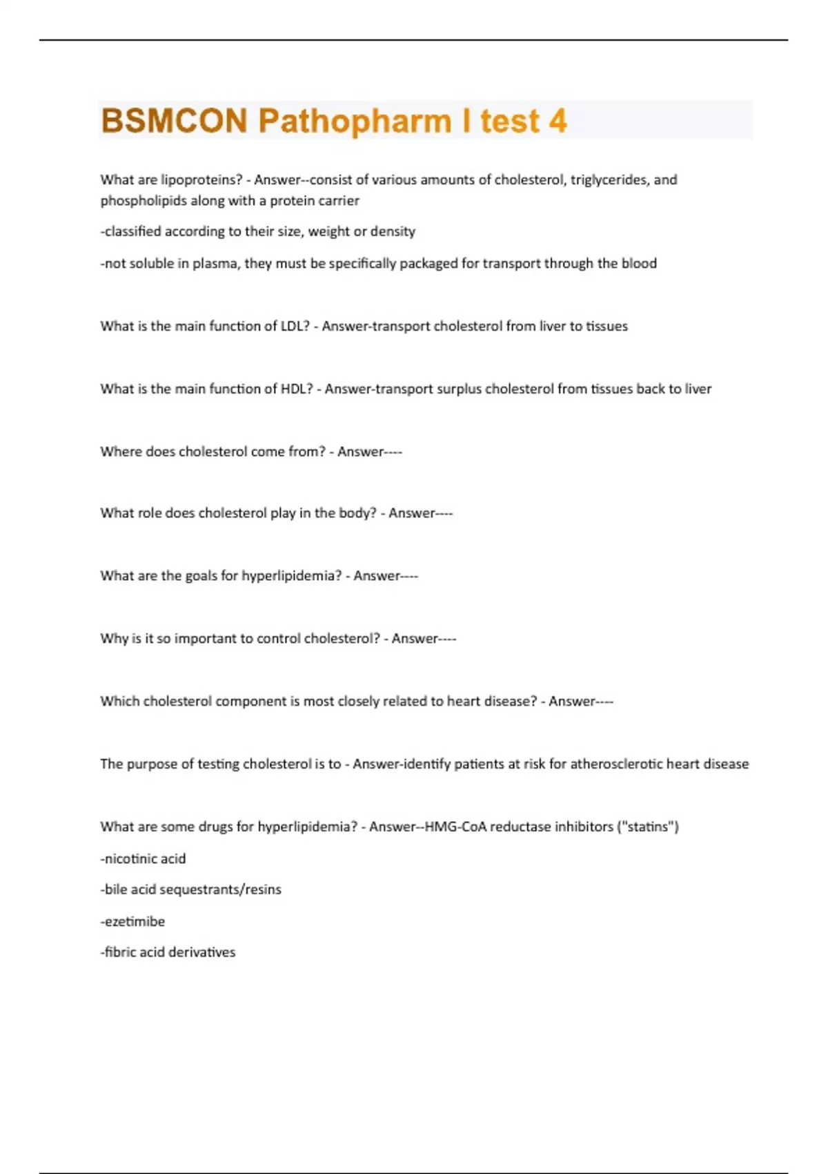 What are lipoproteins? - Answer--consist of various amounts of cholesterol, triglycerides, and phospholipids along with a protein carrier -classified according to their size, weight or density -not soluble in plasma, they must be specifically packaged for transport through the blood What is the main function of LDL? - Answer-transport cholesterol from liver to tissues What is the main function of HDL? - Answer-transport surplus cholesterol from tissues back to liver Where does cholesterol come from? - Answer---- What role does cholesterol play in the body? - Answer---- What are the goals for hyperlipidemia? - Answer---- Why is it so important to control cholesterol? - Answer---- Which cholesterol component is most closely related to heart disease? - Answer---- The purpose of testing cholesterol is to - Answer-identify patients at risk for atherosclerotic heart disease What are some drugs for hyperlipidemia? - Answer--HMG-CoA reductase inhibitors ("statins") -nicotinic acid -bile acid sequestrants/resins -ezetimibe -fibric acid derivativesSelection of drug and dose depends on: - Answer--patients allergies and medication tolerability -LDL and TG levels -co-morbid conditions What is the mechanism of action for "statins"? - Answer--inhibit HMG-CoA reductase -increases the LDL receptor sites on liver cells thus increasing the uptake of LDL from the blood -have been shown to slow the progression of CAD and to reduce mortality from cardiovascular disease -oral What are the prototypes for statin? - Answer--atorvastatin -lovastatin -simvastatin -pravastatin -fluvastatin -rosuvastatin draw slide 10 - AnswerWhat are some potential adverse effects of statins? - Answer--liver dysfunction -myopathy: muscle pain, tenderness, weakness-most common reason for discontinuation -rhabdomyolysis (breaks down overworked muscles) What are some clinical considerations for statins? - Answer--check LFTs prior to initiation and clinically thereafter if indicated -limit alcohol and acetaminophen use -take with evening meal (b/c it minimizes GI upset & cholesterol biosynthesis is greatest at night) -contraindicated in pregnancy -avoid grapefruit juice -careful with CYP 3A4 interactionsWhat is niacin (nicotinic acid) and the mechanism of action? - Answer--B complex vitamin -mechanism of action not fully understood; partial inhibition of fatty acid release from adipose tissue; increased lipoprotein lipase activity; reduces total cholesterol, TG,LDL & increases HDL -oral What are some adverse effects for niacin? - Answer--intense flushing of the face, head and neck= lobster! (can be reduced by taking aspirin 30 min or ibuprofen 60 min before each dose) -GI upset (nausea, bloating, diarrhea) (take with food) -hepatotoxic -hyperglycemia- not usually given for patients with diabetes