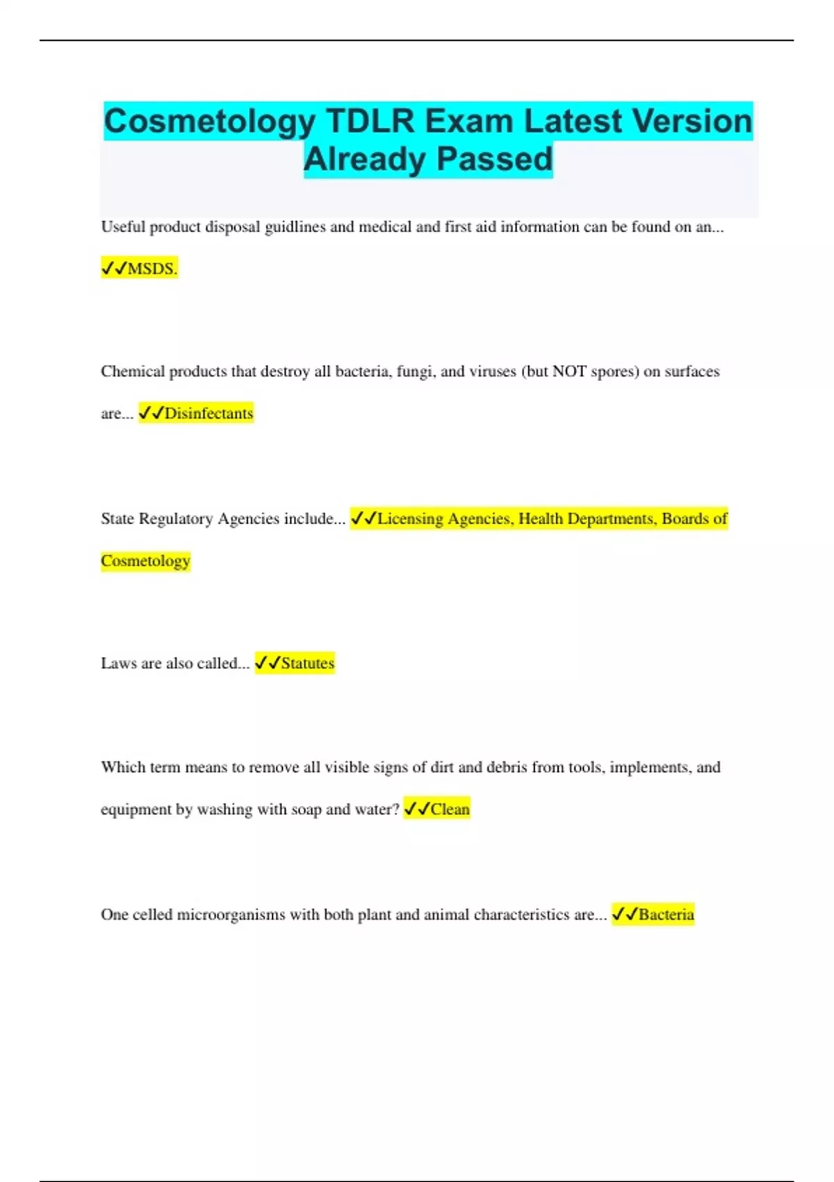 Cosmetology TDLR Exam Latest Version Already Passed