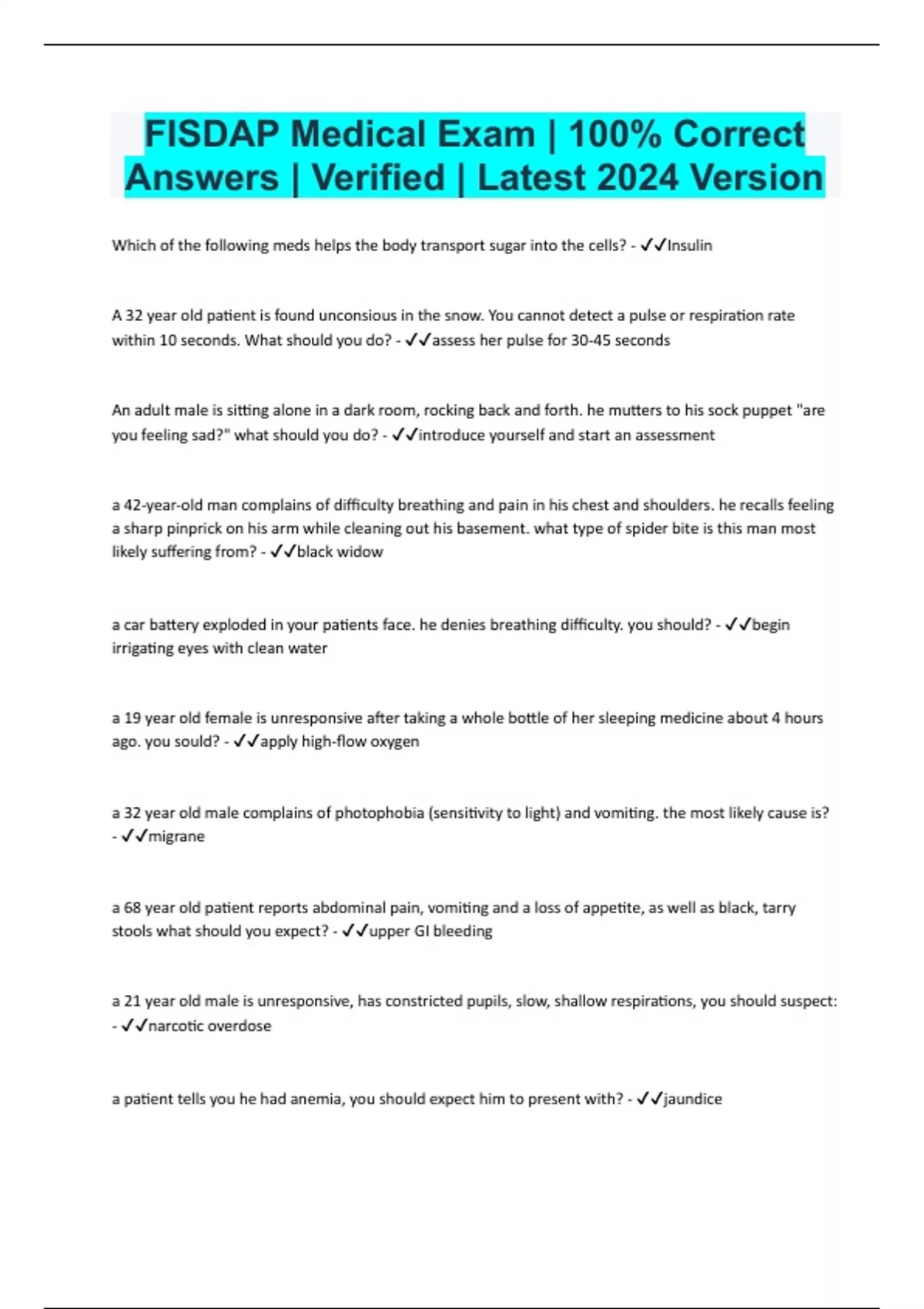 FISDAP Medical Exam | 100% Correct Answers | Verified | Latest 2024 Version Which of the following meds helps the body transport sugar into the cells? - Insulin A 32 year old patient is found unconsious in the snow. You cannot detect a pulse or respiration rate within 10 seconds. What should you do? - assess her pulse for 30-45 seconds An adult male is sitting alone in a dark room, rocking back and forth. he mutters to his sock puppet "are you feeling sad?" what should you do? - introduce yourself and start an assessment a 42-year-old man complains of difficulty breathing and pain in his chest and shoulders. he recalls feeling a sharp pinprick on his arm while cleaning out his basement. what type of spider bite is this man most likely suffering from? - black widow a car battery exploded in your patients face. he denies breathing difficulty. you should? - begin irrigating eyes with clean water a 19 year old female is unresponsive after taking a whole bottle of her sleeping medicine about 4 hours ago. you sould? - apply high-flow oxygen a 32 year old male complains of photophobia (sensitivity to light) and vomiting. the most likely cause is? - migrane a 68 year old patient reports abdominal pain, vomiting and a loss of appetite, as well as black, tarry stools what should you expect? - upper GI bleeding a 21 year old male is unresponsive, has constricted pupils, slow, shallow respirations, you should suspect: - narcotic overdose a patient tells you he had anemia, you should expect him to present with? - jaundice your epileptic patient complains of persistent metallic taste in her mouth. you should suspect: - a seizure may occur patient is having a tonic-clonic seizure and is not breathing. you should: - prevent patient from further injury an 18 year old male states "the CIA is after me" you notice he has covered his head and windows with aluminum foil. when you ask why he says "in order to block out the government radio waves" vitals are BP138/34, P122, R24. you should suspect? - paranoid schizophrenia a patient is running a high fever, vomiting and reporting pain that has shifted from around her belly button to the lower right area of her abdomen you should suspect? - appendicitis a 20 year old male in a college dorm room complains of fever, headache, and a stiff neck. he has an altered mental status, and you notice red blotches on his skin. which of the following are the most appropriate BSI precautions - gloves and HEPA mask an unconscious patient has one pupil that is significantly larger than the other and not reactive to light. the most likely cause is: - stroke what is hyperglycemia - high blood sugar when assessing a patient for facial droop you should? - ask the patient to smile or show his teeth an alert patient has a severe headache/weakness of the left arm you should suspect? - stroke a 28 year old patient is outside at a concert and appears confused. he is unable to answer your questions. you should - look for medical identification necklace or bracelet your first priority when dealing with a patient who is exhibiting behavior issues is - ensure the saety of yourself and your partner which of the following most accurately describes