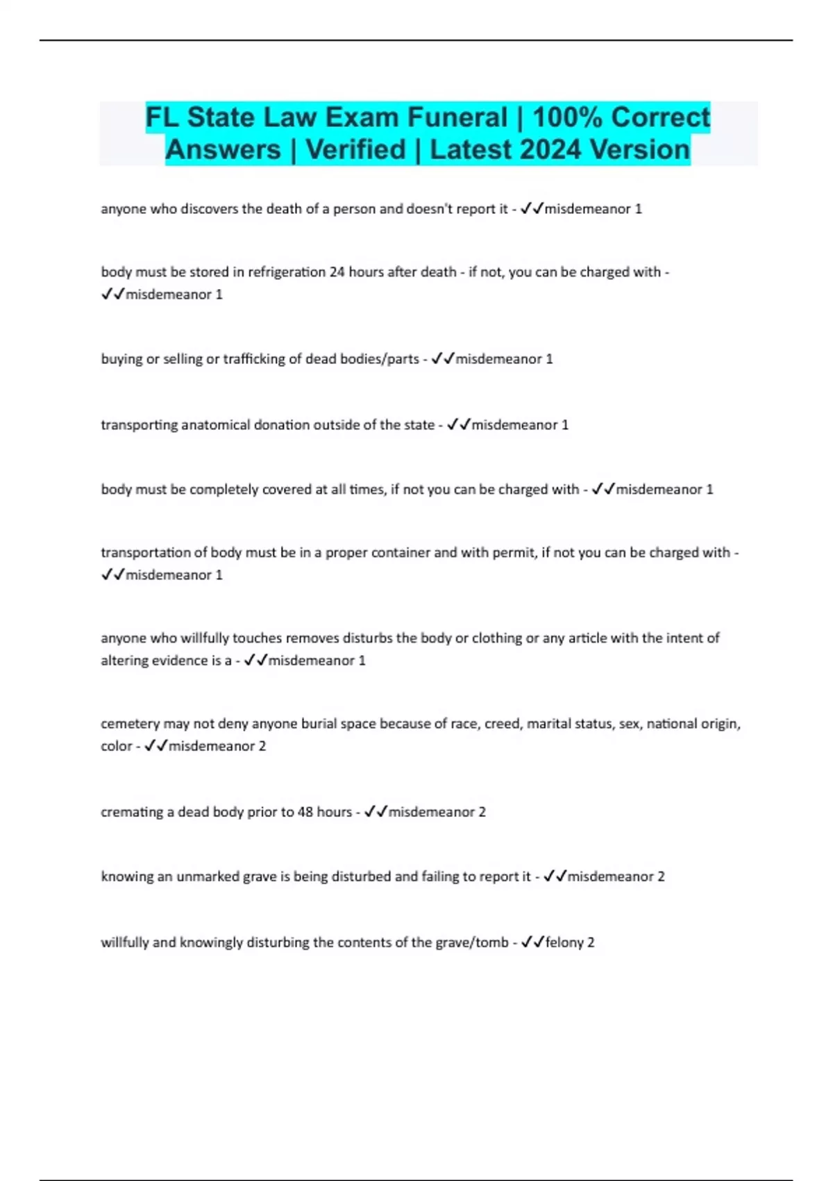 FL State Law Exam Funeral | 100% Correct Answers | Verified | Latest 2024 Version anyone who discovers the death of a person and doesn't report it - misdemeanor 1 body must be stored in refrigeration 24 hours after death - if not, you can be charged with - misdemeanor 1 buying or selling or trafficking of dead bodies/parts - misdemeanor 1 transporting anatomical donation outside of the state - misdemeanor 1 body must be completely covered at all times, if not you can be charged with - misdemeanor 1 transportation of body must be in a proper container and with permit, if not you can be charged with - misdemeanor 1 anyone who willfully touches removes disturbs the body or clothing or any article with the intent of altering evidence is a - misdemeanor 1 cemetery may not deny anyone burial space because of race, creed, marital status, sex, national origin, color - misdemeanor 2 cremating a dead body prior to 48 hours - misdemeanor 2 knowing an unmarked grave is being disturbed and failing to report it - misdemeanor 2 willfully and knowingly disturbing the contents of the grave/tomb - felony 2 sexual abuse on a dead body - felony 2 no person shall knowingly offer to purchase or sell, or purchase to sell, or otherwise transfer, any human organ for valuable consideration - felony 2 anyone who releases autopsy photos and records - felony 3 willfully and knowingly destroying a monument - felony 3 knowingly disturbing, destroying, removing, vandalizing, or damaging an unmarked human burial - felony 3 knowingly giving false information in the course of applying for licensure - felony 3 act of attempting to obtain or obtaining a license to practice by misleading statements - felony 3 all death certificates must be typed in - permanent black ink fd who first assumes custody of a body has how many days to file the BTP - 5 days medical certification portion of the DC has to be signed within how many hours - 72 hours if a physician is unable to sign, an extension can be given of how many days - 5 after how many days of not seeing a physician should the death be reported to the ME - 30days if the ME completes the medical certification, it should be completed within how many hours - 72hours Prisoners of War are given which expenses - notification,