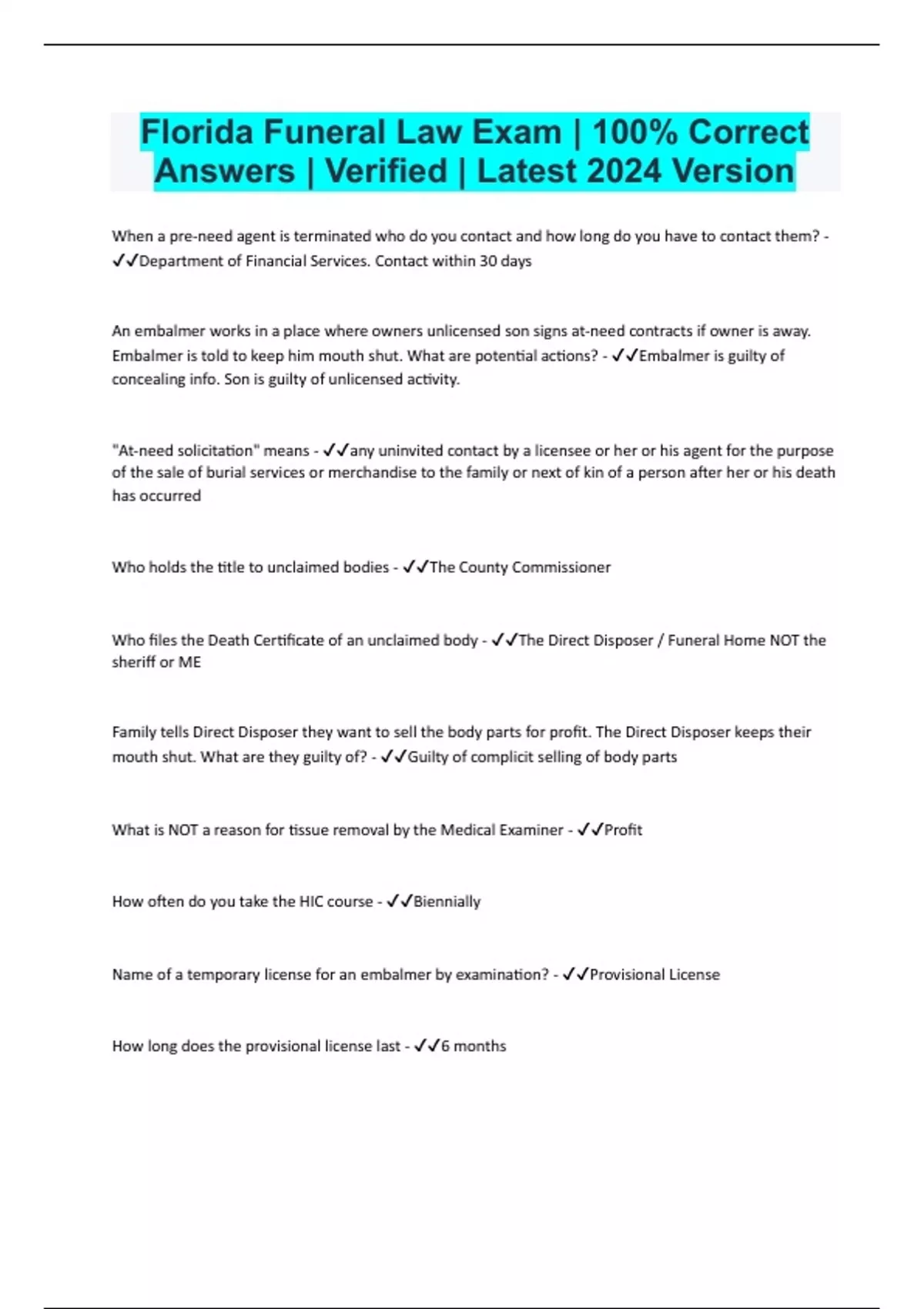 Florida Funeral Law Exam | 100% Correct Answers | Verified | Latest 2024 Version When a pre-need agent is terminated who do you contact and how long do you have to contact them? - Department of Financial Services. Contact within 30 days An embalmer works in a place where owners unlicensed son signs at-need contracts if owner is away. Embalmer is told to keep him mouth shut. What are potential actions? - Embalmer is guilty of concealing info. Son is guilty of unlicensed activity. "At-need solicitation" means - any uninvited contact by a licensee or her or his agent for the purpose of the sale of burial services or merchandise to the family or next of kin of a person after her or his death has occurred Who holds the title to unclaimed bodies - The County Commissioner Who files the Death Certificate of an unclaimed body - The Direct Disposer / Funeral Home NOT the sheriff or ME Family tells Direct Disposer they want to sell the body parts for profit. The Direct Disposer keeps their mouth shut. What are they guilty of? - Guilty of complicit selling of body parts What is NOT a reason for tissue removal by the Medical Examiner - Profit How often do you take the HIC course - Biennially Name of a temporary license for an embalmer by examination? - Provisional License How long does the provisional license last - 6 months Requirements for reactivating a delinquent (inactive) license? - New application, all fees, all CEUs, HIV course. (May or may not require board appearance) Who governs Mortuary Schools Curriculum? - The Funeral Service Education Board Which of the following are DD penalties? - The one without the word "only". "Only" is always too limiting in exams When a PN is to be refunded. What money is refunded? - ONLY the amount paid in. No extra (damages, no extra 10%, ext.) Where do you go to file a complaint against a cemetery - The Department of Financial Services The cemetery crew buries a body in the wrong space. What do they do? - Contact the FD (not ignore it, not file for new permit from vitals) What do you do with the cremation container? - Use it, unless written instructions from the family (not recycle, re-sell, toss, etc) What is NOT a pre-need violation - Giving a prompt refund (others listed are negative) Who CANNOT retrieve an unclaimed body from Anat Board? - Medical Examiner (others listed are friends and family) Who is not on the MEC? - The city manager How soon should the ME get an unclaimed body to the Anat board? - As soon as possible (not specifies such as 48, 72 hours... they need time to try and ID the body What are the restriction on an inspection? Prep room? Admin offices? - No restrictions What happens when multiple military deaths with co-mingled remains? - They are placed in a common grave in a national cemetery