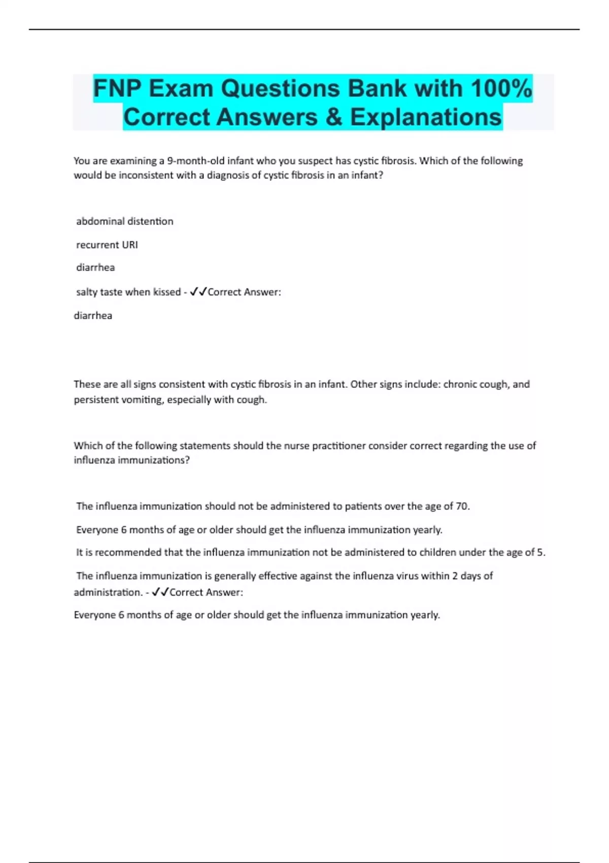 FNP Exam Questions Bank with 100% Correct Answers & Explanations You are examining a 9-month-old infant who you suspect has cystic fibrosis. Which of the following would be inconsistent with a diagnosis of cystic fibrosis in an infant? abdominal distention recurrent URI diarrhea salty taste when kissed - Correct Answer: diarrhea These are all signs consistent with cystic fibrosis in an infant. Other signs include: chronic cough, and persistent vomiting, especially with cough. Which of the following statements should the nurse practitioner consider correct regarding the use of influenza immunizations? The influenza immunization should not be administered to patients over the age of 70. Everyone 6 months of age or older should get the influenza immunization yearly. It is recommended that the influenza immunization not be administered to children under the age of 5. The influenza immunization is generally effective against the influenza virus within 2 days of administration. - Correct Answer: Everyone 6 months of age or older should get the influenza immunization yearly. The nurse practitioner should know that everyone 6 months of age or older should get the influenza immunization yearly. The influenza immunization is generally effective against the influenza virus within 2 weeks of administration. If the FNP is giving the Mini-mental exam (MME) to an elderly patient, which subject area is being tested when the FNP asks the patient to spell a word backwards? attention and calculation orientation recall sentence writing - Correct Answer: attention and calculation The MME is a brief screening exam to assess for dementia. Five subject areas are tested. The area tested by asking the patient to spell a word backwards is attention and calculation. Which of the following should be done for diabetic patients with insulin resistance requiring more than 200 units per day? change to less immunogenic pork or human synthetic insulins administer a higher dosage of insulin use purified insulin and inject directly into atrophic areas use amylin analogs instead of insulin - Correct Answer: change to less immunogenic pork or human synthetic insulins Insulin resistance requiring more than 200 unites per day is rare and even less common with increased use of human inclines. The cause is overproduction of insulin binding immunoglobulins. Treatment is to change to less immunogenic pork or human synthetic insults. It may require glucocorticoid treatment; consultation required. What is the Catarrhal stage of Pertussis - Usually 7-10 days; range of 4-21 Characterized by: Coryza Low-grade fever Mild, occasional cough (which gradually becomes more severe) What is the Paroxysmal stage of Pertussis - Usually lasts 1-6 weeks, but may persist for up to 10 weeks Characterized by: Paroxysms of numerous, rapid coughs due to difficulty expelling thick mucus from the tracheobronchial tree Long inspiratory effort accompanied by a high-pitched "whoop" at the end of the paroxysms Cyanosis Vomiting and exhaustion Paroxysmal attacks: Occur frequently at night, with an average of 15 attacks per 24 hours Increase in frequency during the first 1-2 weeks, remain at the same frequency for 2-3 weeks, and then gradually decrease Your follow-up of a patient reveals Jarisch-Herxheimer reaction. This is a reaction that occurs in approximately 30% of patients treated for which of the following diseases? hepatitis B gonorrhea herpes simplex primary syphilis - Correct Answer: primary syphilis Jarisch-Herxheimer reaction is a reaction that occurs in approximately 30% of patients treated for primary syphilis. It occurs in approximately 70% of those treated for secondary syphilis within 24 hours of treatment. You have a 59-year-old female patient with osteoporosis. Which of the following would you NOT expect to find in the radiographic results of this patient? changes in vertebral body shape increased radiodensity fractures generalized osteopenia - Correct Answer: