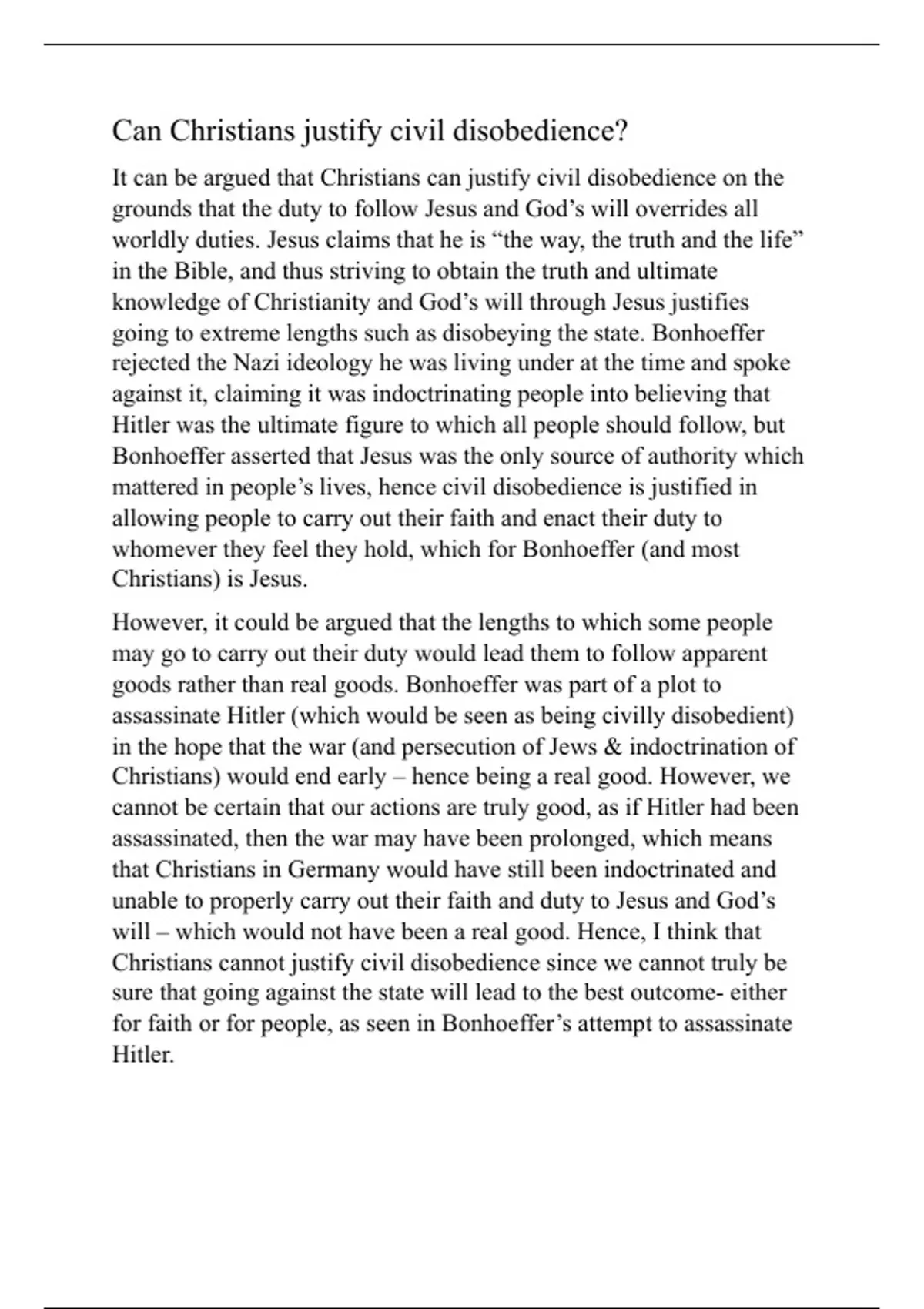 going to extreme lengths such as disobeying the state. Bonhoeffer