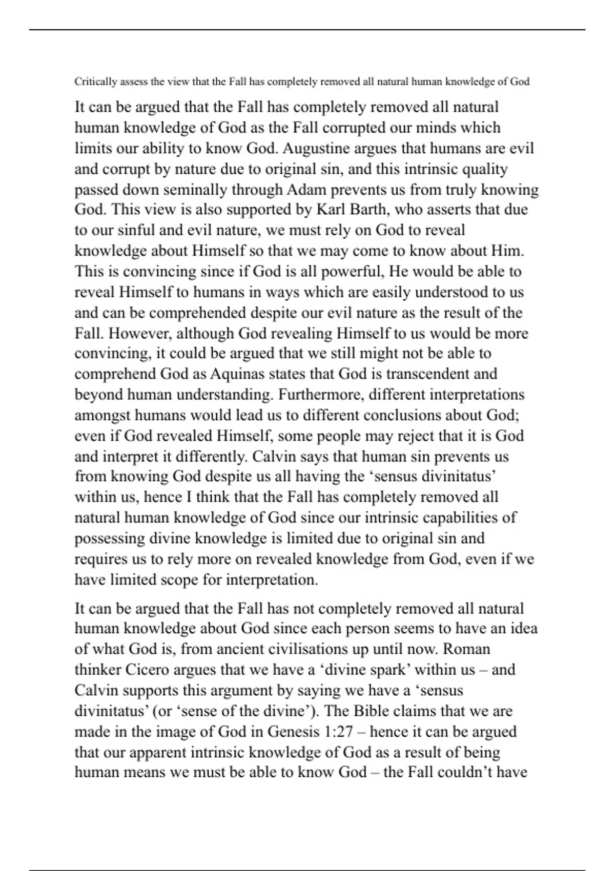 Critically assess the view that the Fall has completely removed all natural human knowledge of God