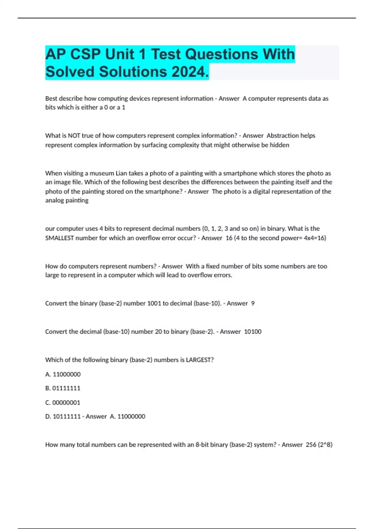 Best describe how computing devices represent information - Answer A computer represents data as bits which is either a 0 or a 1 What is NOT true of how computers represent complex information? - Answer Abstraction helps represent complex information by surfacing complexity that might otherwise be hidden When visiting a museum Lian takes a photo of a painting with a smartphone which stores the photo as an image file. Which of the following best describes the differences between the painting itself and the photo of the painting stored on the smartphone? - Answer The photo is a digital representation of the analog painting our computer uses 4 bits to represent decimal numbers (0, 1, 2, 3 and so on) in binary. What is the SMALLEST number for which an overflow error occur? - Answer 16 (4 to the second power= 4x4=16) How do computers represent numbers? - Answer With a fixed number of bits some numbers are too large to represent in a computer which will lead to overflow errors. Convert the binary (base-2) number 1001 to decimal (base-10). - Answer 9 Convert the decimal (base-10) number 20 to binary (base-2). - Answer 10100 Which of the following binary (base-2) numbers is LARGEST? A. B. C. D. - Answer A. How many total numbers can be represented with an 8-bit binary (base-2) system? - Answer 256 (2^8)