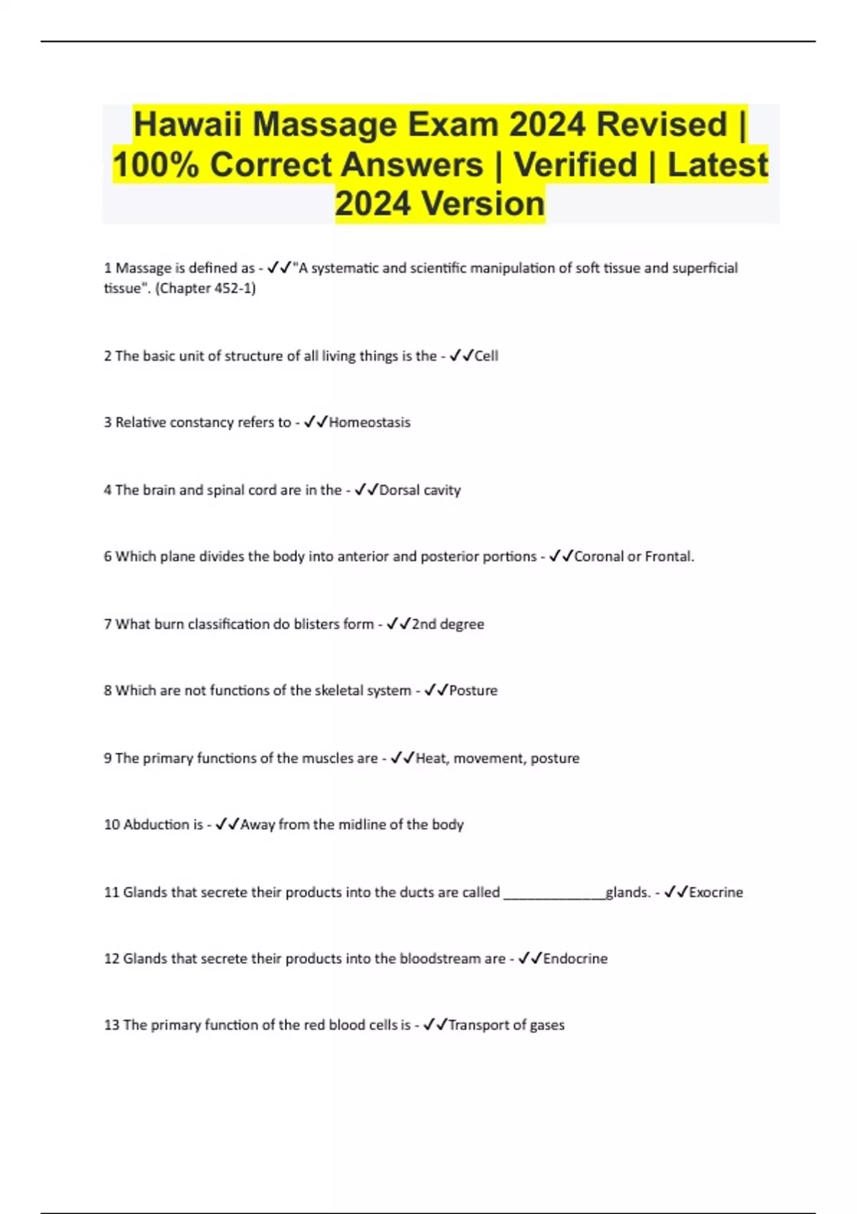 Hawaii Massage Exam 2024 Revised | 100% Correct Answers | Verified | Latest 2024 Version 1 Massage is defined as - "A systematic and scientific manipulation of soft tissue and superficial tissue". (Chapter 452-1) 2 The basic unit of structure of all living things is the - Cell 3 Relative constancy refers to - Homeostasis 4 The brain and spinal cord are in the - Dorsal cavity 6 Which plane divides the body into anterior and posterior portions - Coronal or Frontal. 7 What burn classification do blisters form - 2nd degree 8 Which are not functions of the skeletal system - Posture 9 The primary functions of the muscles are - Heat, movement, posture 10 Abduction is - Away from the midline of the body 11 Glands that secrete their products into the ducts are called _____________glands. - Exocrine 12 Glands that secrete their products into the bloodstream are - Endocrine 13 The primary function of the red blood cells is - Transport of gases 14 Blood is composed of - Plasma, RBCs, WBCs, platelets 15 The universal blood donor is "O" whereas the universal recipient is - "AB". 16 The two systems responsible for gas exchange are - Respiratory and cardiovascular 17 The structure where the gas exchange takes place is the - Alveolus (located in the lung) 18 The sequential order for passage of air expiration is - Bronchi, trachea, larynx, pharynx 19 Carbohydrate digestion is accomplished by the following enzymes - a) amylase, b) maltase, c) sucrase, 20 The functional unit of the kidney is - Nephron 21 The term that describes the reclining (face up) position is - Supine 22 The humerus articulates with the - Ulna 23 The four types of tissue are - CMEN- connective, muscle, epithelial, nervous 24 Anatomy is - The study of the structure of all living things 25 The anatomical position is - Body erect, arms at side, palms forward 26 A sagittal plane - Divides the body between right and left (Coronal/frontal = anterior and posterior, Transverse = upper and lower) 27 The body's most important function is - Survival 28 What separates the Thoracic and Abdominopelvic cavities - Diaphram 30 What connects muscles to bones - Tendons 31 To sedate a client, which of the following is indicated - a) slow movement, b) rhythmic movement, c) moderate pressure, 32 R.I.C.E. stands for - rest, ice, compression. elevation (swelling/joint injury) 33 The shoulder joint is an example of a - ball and socket (shoulder & hip) 34 What do you do if you are working on a client and he/she complains of pain where you are working - Back off and continue communication to be sure they are comfortable 35 What is the best position for massaging a pregnant woman - Lateral recumbent (lying on side) 36 Which endangerment site is located behind the knee - Popliteal artery 37 Which endangerment site is located in the anterior elbow