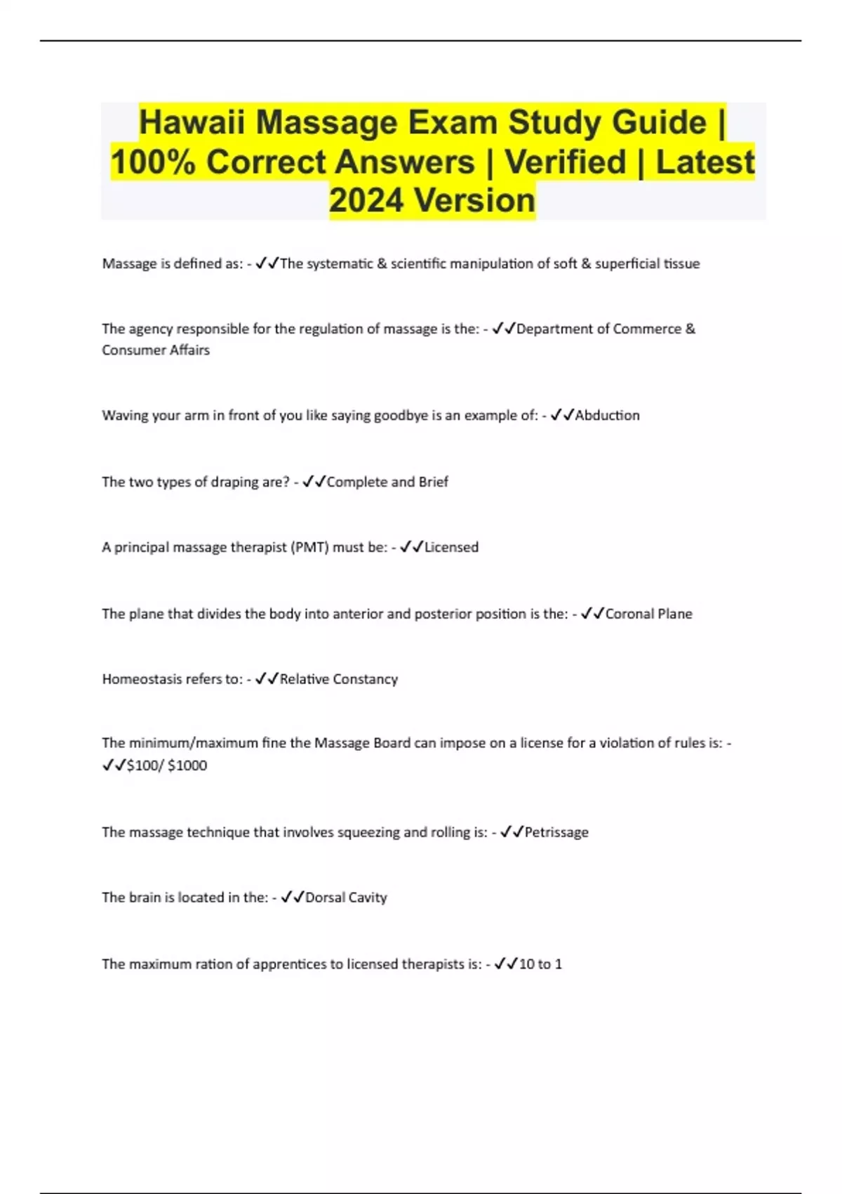 Hawaii Massage Exam Study Guide | 100% Correct Answers | Verified | Latest 2024 Version