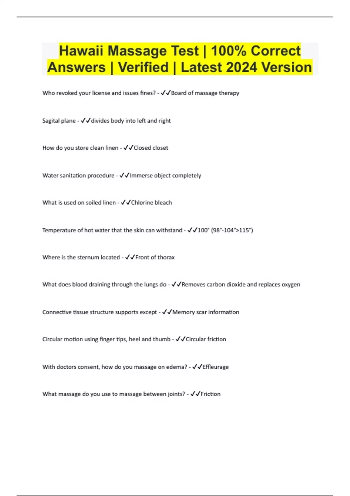 Hawaii Massage Test | 100% Correct Answers | Verified | Latest 2024 Version Who revoked your license and issues fines? - Board of massage therapy Sagital plane - divides body into left and right How do you store clean linen - Closed closet Water sanitation procedure - Immerse object completely What is used on soiled linen - Chlorine bleach Temperature of hot water that the skin can withstand - 100° (98°-104°>115°) Where is the sternum located - Front of thorax What does blood draining through the lungs do - Removes carbon dioxide and replaces oxygen Connective tissue structure supports except - Memory scar information Circular motion using finger tips, heel and thumb - Circular friction With doctors consent, how do you massage on edema? - Effleurage What massage do you use to massage between joints? - Friction What do you do when a first time client is worried about drapping? - Offer fully draped and or clothes on Bilateral, unilateral, and lateral flexion on the neck. What muscle? - SCM (sternocleidomastoid) Sanitation of sheets. How often? - After each client, wash with soapy water, 10% bleach How do you avoid rancid odors collecting in the sheets? - Wash daily Could you practice massage with a different business? - Yes with floor to ceiling partition What nerve supplies the forearm, wrist, and side of thumb? - Radial First four lumbar nerves do what? - Lumbar plexus(hip), femoral nerve, saphenous nerve( innervates lower back and anterior aspect of legs) A system that keeps clients/therapists safe from diseases of blood? - Universal precautions A system of body deals with blood, veins, capillaries? - Cardiovascular system Lymphatic (drainage) systems excrete at all places except? - Cranial Laws(5.10.15) - 5 days to notify board (pmt left), 10 days to designate new PMT, after 15 days license will be suspended. The apprentice license can be revoked if all happens except - Change SMT with written notice PMT's license can be revoked if - Abandoning premises What part of the body is found in the lumbar region? - Lower back What nerve supplies the foot and toes? - Plantar Sciatic nerve supplies - Sciatic( tibial nerve, peroneal nerve), hip, posterior leg( hamstring), foot and toe Largest organ of the body - Skin Largest artery - Aorta Dark patches - Melanoma