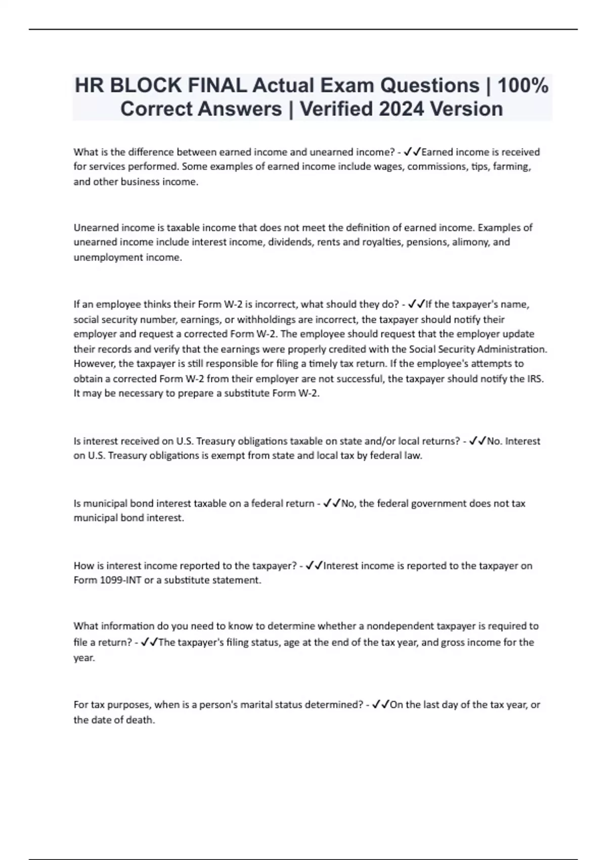 HR BLOCK FINAL Actual Exam Questions | 100% Correct Answers | Verified 2024 Version What is the difference between earned income and unearned income? - Earned income is received for services performed. Some examples of earned income include wages, commissions, tips, farming, and other business income. Unearned income is taxable income that does not meet the definition of earned income. Examples of unearned income include interest income, dividends, rents and royalties, pensions, alimony, and unemployment income. If an employee thinks their Form W-2 is incorrect, what should they do? - If the taxpayer's name, social security number, earnings, or withholdings are incorrect, the taxpayer should notify their employer and request a corrected Form W-2. The employee should request that the employer update their records and verify that the earnings were properly credited with the Social Security Administration. However, the taxpayer is still responsible for filing a timely tax return. If the employee's attempts to obtain a corrected Form W-2 from their employer are not successful, the taxpayer should notify the IRS. It may be necessary to prepare a substitute Form W-2. Is interest received on U.S. Treasury obligations taxable on state and/or local returns? - No. Interest on U.S. Treasury obligations is exempt from state and local tax by federal law. Is municipal bond interest taxable on a federal return - No, the federal government does not tax municipal bond interest. How is interest income reported to the taxpayer? - Interest income is reported to the taxpayer on Form 1099-INT or a substitute statement. What information do you need to know to determine whether a nondependent taxpayer is required to file a return? - The taxpayer's filing status, age at the end of the tax year, and gross income for the year. For tax purposes, when is a person's marital status determined? - On the last day of the tax year, or the date of death. How much is added to the standard deduction if the taxpayer (or spouse) is age 65 or older, or blind? - $1,350 for married taxpayers and qualifying widow(er)s, or $1,700 for those filing single or head of household. What is the personal exemption amount for 2021 - There is no personal exemption for 2021. A personal exemption was an amount previously allowed by law to reduce income that would otherwise be taxed. The Tax Cuts and Jobs Act of 2017 repealed this deduction beginning in 2018. How is the gross income filing requirement determined for most nondependent taxpayers - The taxpayer's standard deduction, including the additional amounts for age. However, for married filing separately, or married filing jointly when the spouses did not live together at the end of the year, the amount is $5. What is the difference between injured spouse allocation and innocent spouse relief? - The IRS provides an injured spouse allocation for the taxpayer to protect their portion of a refund from a spouse's past-due federal income tax, unpaid student loans, unpaid child and spousal support, or state income tax. The IRS provides innocent spouse relief to taxpayers who file a joint return and later learn that their spouse has underestimated income (or overstated a credit or deduction) on the return. Is unemployment compensation taxable? - Yes, unemployment compensation is fully taxable. Are scholarships and fellowships taxable? - Sometimes. Generally, scholarships and fellowships are excluded from income by degree-seeking candidates to the extent that they are used to pay qualified education expenses, such as tuition and course-related fees. However, if they are used to pay for room and board or other expenses, they are taxable. What document will the taxpayer receive from their employer reporting disability pension payments? - The income is reported on Form 1099-R Under what circumstances can a disability pension qualify as earned income for the EIC? - Disability pension income received before the taxpayer attains minimum retirement age for their company is reported as wage income. It is also considered earned income for purposes of EIC. What types of income must be reported on Schedule 1 (Form 1040) and then reported on Form 1040? - Gambling winnings, alimony, jury duty pay, canceled debts, and hobby income are some examples of income that must be reported on Schedule 1 (Form 1040) and then reported on Form 1040. What are the adjustments that can be claimed on Schedule 1 (Form 1040)? - Some examples of adjustments that can be claimed on Schedule 1 are: Educator expense deduction. The health savings account (HSA) deduction. Moving expenses for members of the military. Self-employment tax deduction. Self-employed health insurance deduction. Penalty on early withdrawal of savings. Alimony payments. IRA deduction. Student loan interest deduction. How much may an eligible educator deduct for qualified classroom expenses as an adjustment to income? - Up to $250 per eligible educator. Married taxpayers filing a joint return who are both