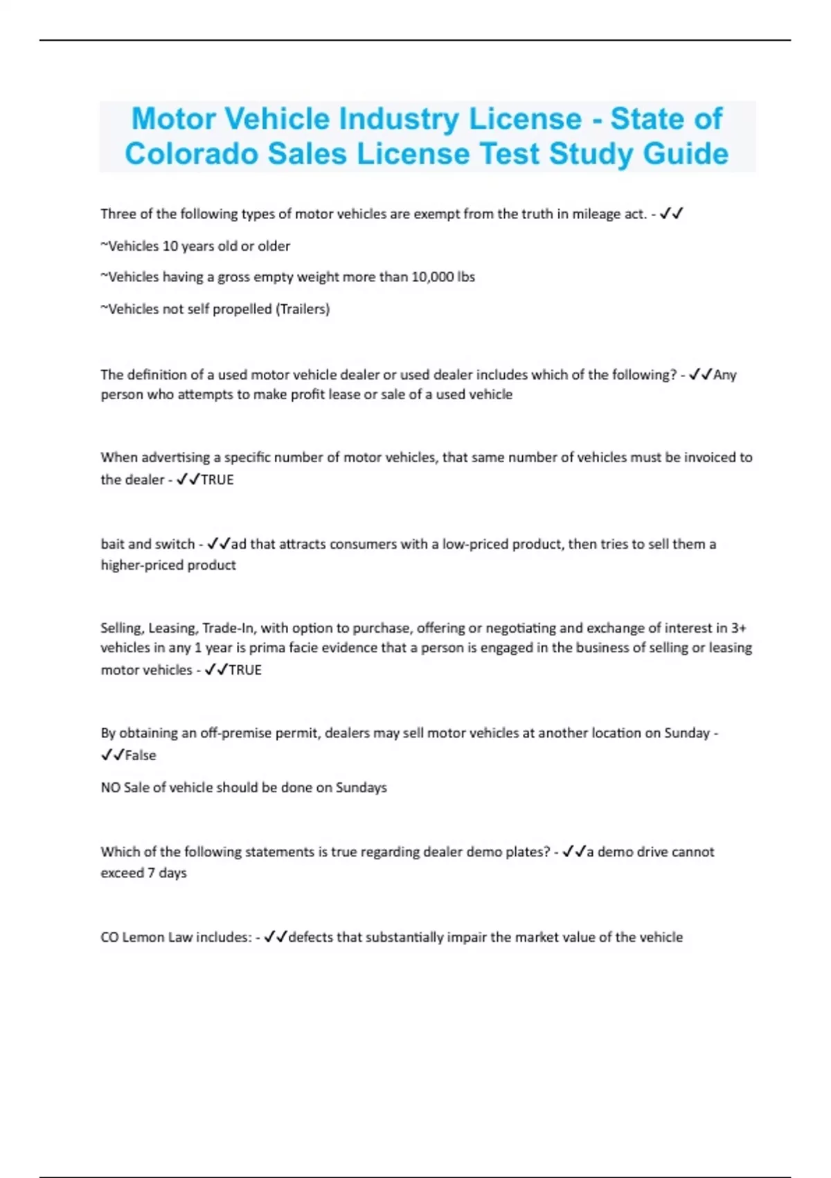 Three of the following types of motor vehicles are exempt from the truth in mileage act. - ~Vehicles 10 years old or older ~Vehicles having a gross empty weight more than 10,000 lbs ~Vehicles not self propelled (Trailers) The definition of a used motor vehicle dealer or used dealer includes which of the following? - Any person who attempts to make profit lease or sale of a used vehicle When advertising a specific number of motor vehicles, that same number of vehicles must be invoiced to the dealer - TRUE bait and switch - ad that attracts consumers with a low-priced product, then tries to sell them a higher-priced product Selling, Leasing, Trade-In, with option to purchase, offering or negotiating and exchange of interest in 3+ vehicles in any 1 year is prima facie evidence that a person is engaged in the business of selling or leasing motor vehicles - TRUE By obtaining an off-premise permit, dealers may sell motor vehicles at another location on Sunday - False NO Sale of vehicle should be done on Sundays Which of the following statements is true regarding dealer demo plates? - a demo drive cannot exceed 7 days CO Lemon Law includes: - defects that substantially impair the market value of the vehicleMotor vehicle insurance is required: - for all registered vehicles intended for use on colorado roads Which is true regarding in-transit plates? - in-transit plates may be used to transport vehicles from point of purchase to point of storage or from point of storage to point of sale Licensed dealers may sell which of the followin