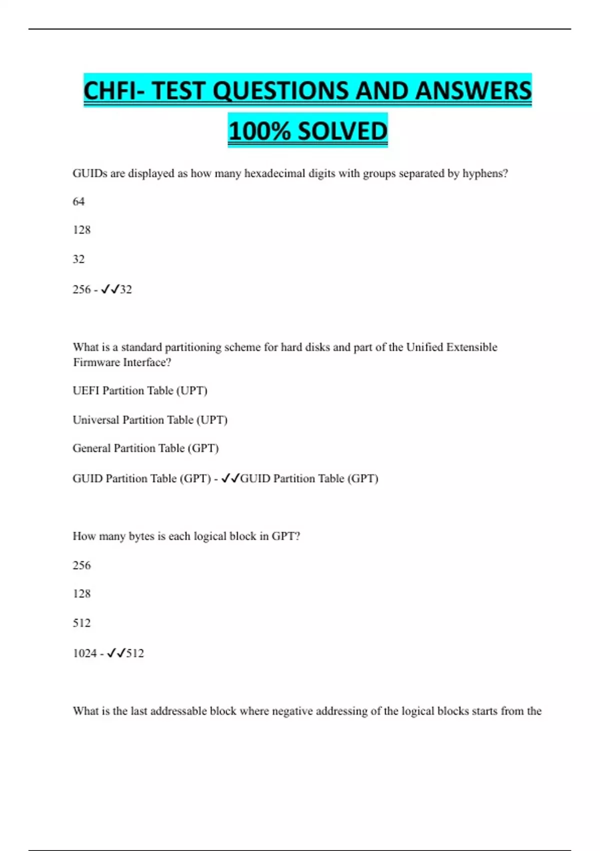CHFI- TEST QUESTIONS AND ANSWERS 100% SOLVED GUIDs are displayed as how many hexadecimal digits with groups separated by hyphens? 64 128 32 256 - 32 What is a standard partitioning scheme for hard disks and part of the Unified Extensible Firmware Interface? UEFI Partition Table (UPT) Universal Partition Table (UPT) General Partition Table (GPT) GUID Partition Table (GPT) - GUID Partition Table (GPT) How many bytes is each logical block in GPT?