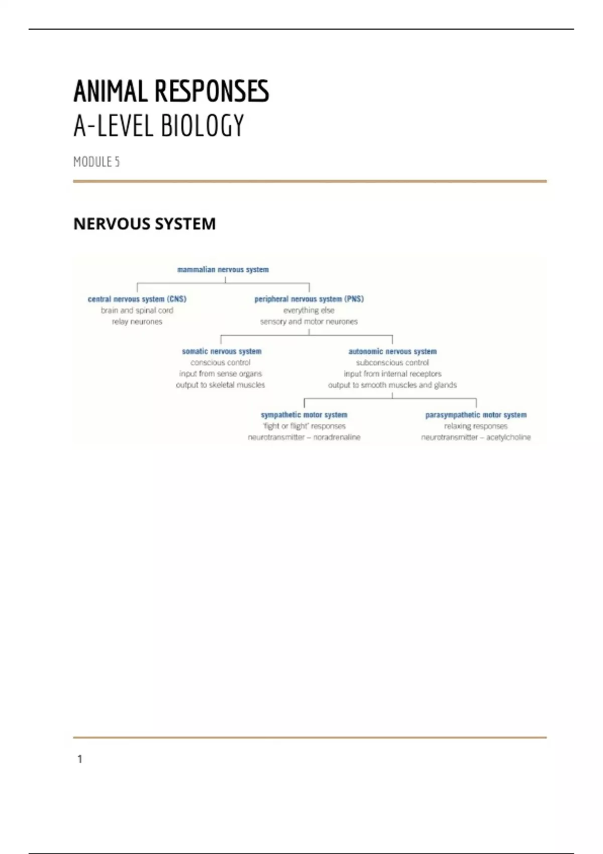 summary notes on animal responses in module 5 including adrenaline, muscle contraction, neuromuscular junction, brain structure, reflexes