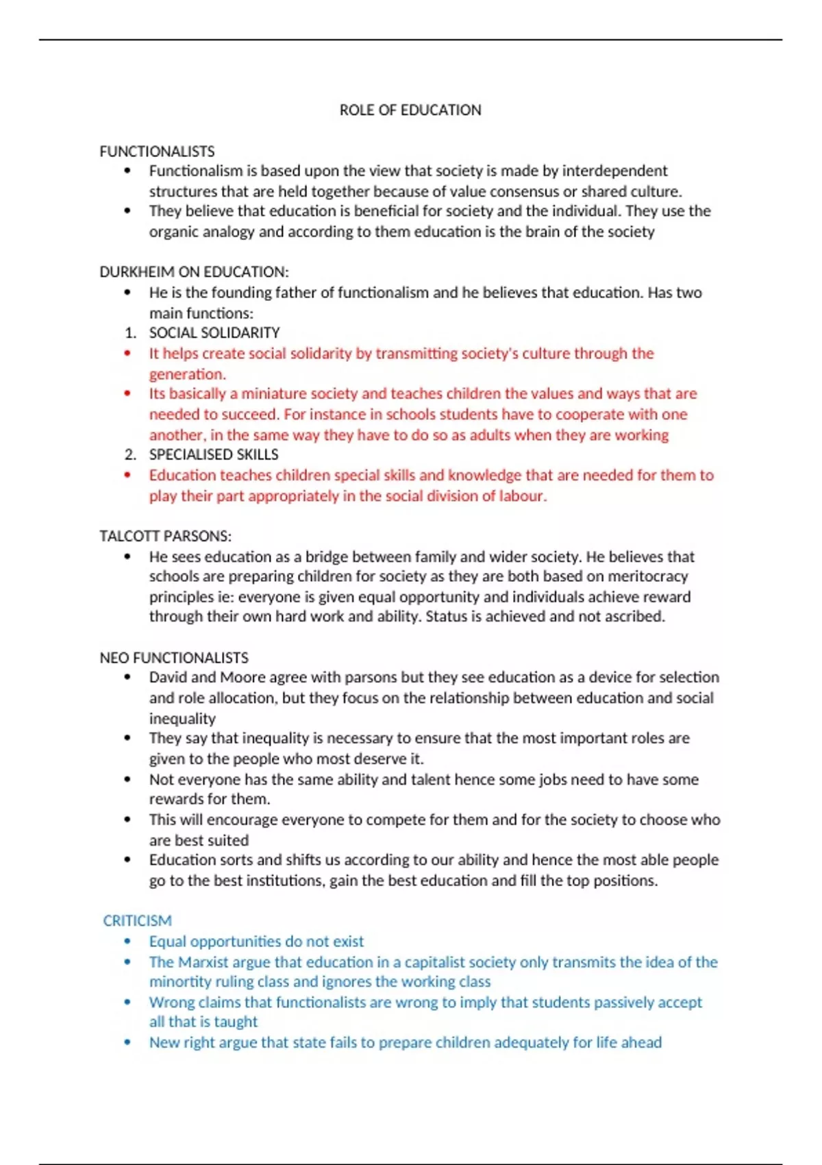 The document examines the role of education and looks at the theoretical perspectives on the role of education.