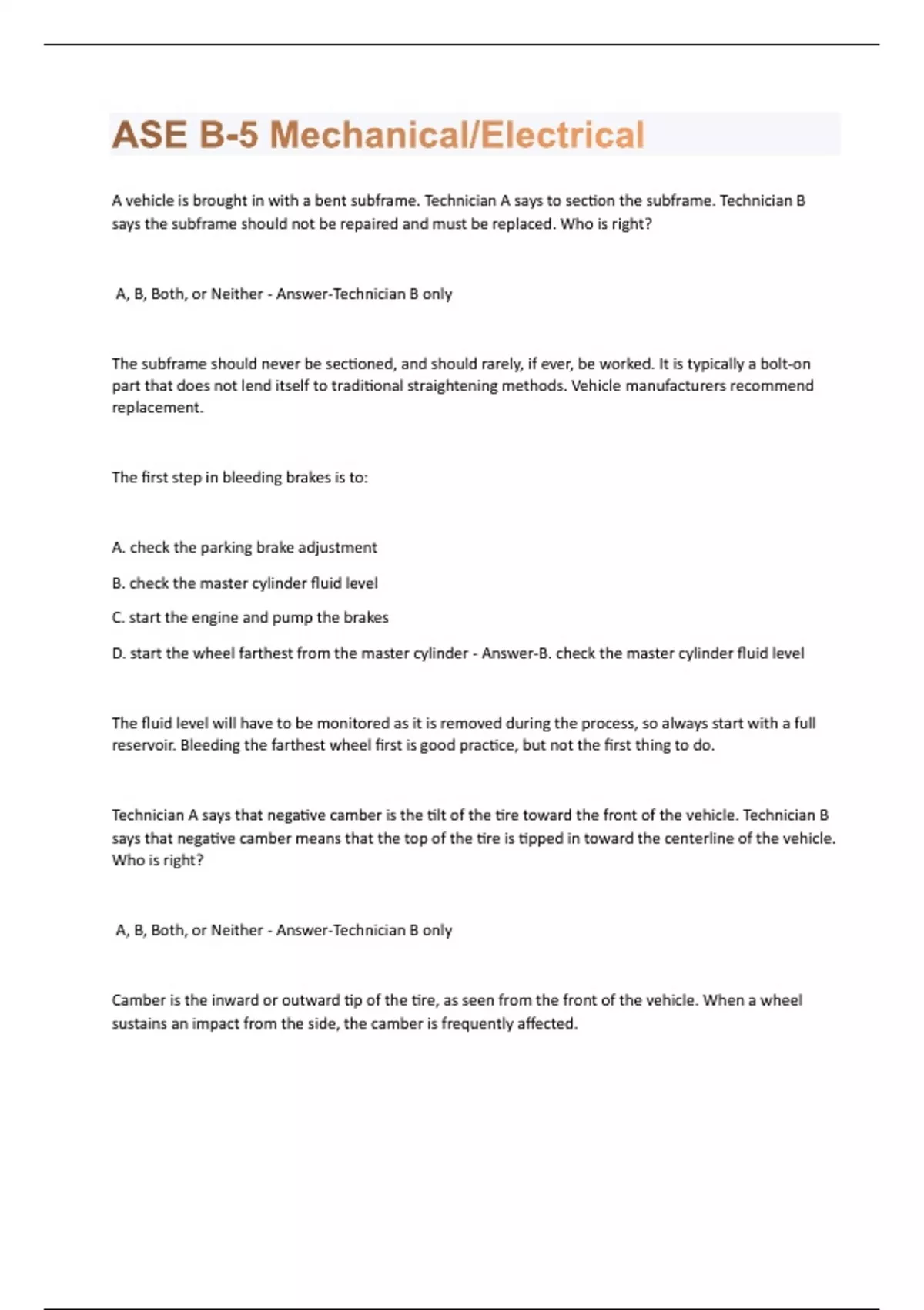 A vehicle is brought in with a bent subframe. Technician A says to section the subframe. Technician B says the subframe should not be repaired and must be replaced. Who is right? A, B, Both, or Neither - Answer-Technician B only The subframe should never be sectioned, and should rarely, if ever, be worked. It is typically a bolt-on part that does not lend itself to traditional straightening methods. Vehicle manufacturers recommend replacement. The first step in bleeding brakes is to: A. check the parking brake adjustment B. check the master cylinder fluid level C. start the engine and pump the brakes D. start the wheel farthest from the master cylinder - Answer-B. check the master cylinder fluid level The fluid level will have to be monitored as it is removed during the process, so always start with a full reservoir. Bleeding the farthest wheel first is good practice, but not the first thing to do. Technician A says that negative camber is the tilt of the tire toward the front of the vehicle. Technician B says that negative camber means that the top of the tire is tipped in toward the centerline of the vehicle. Who is right? A, B, Both, or Neither - Answer-Technician B only Camber is the inward or outward tip of the tire, as seen from the front of the vehicle. When a wheel sustains an impact from the side, the camber is frequently affected.During A/C refrigerant recovery, 1 oz of oil has been recovered from the system. Which of these is the correct procedure? A. return the oil to the system B. replace the oil with new oil C. ignore such a small amount of new oil D. change all the oil in the system - Answer-B. replace the oil with new oil
