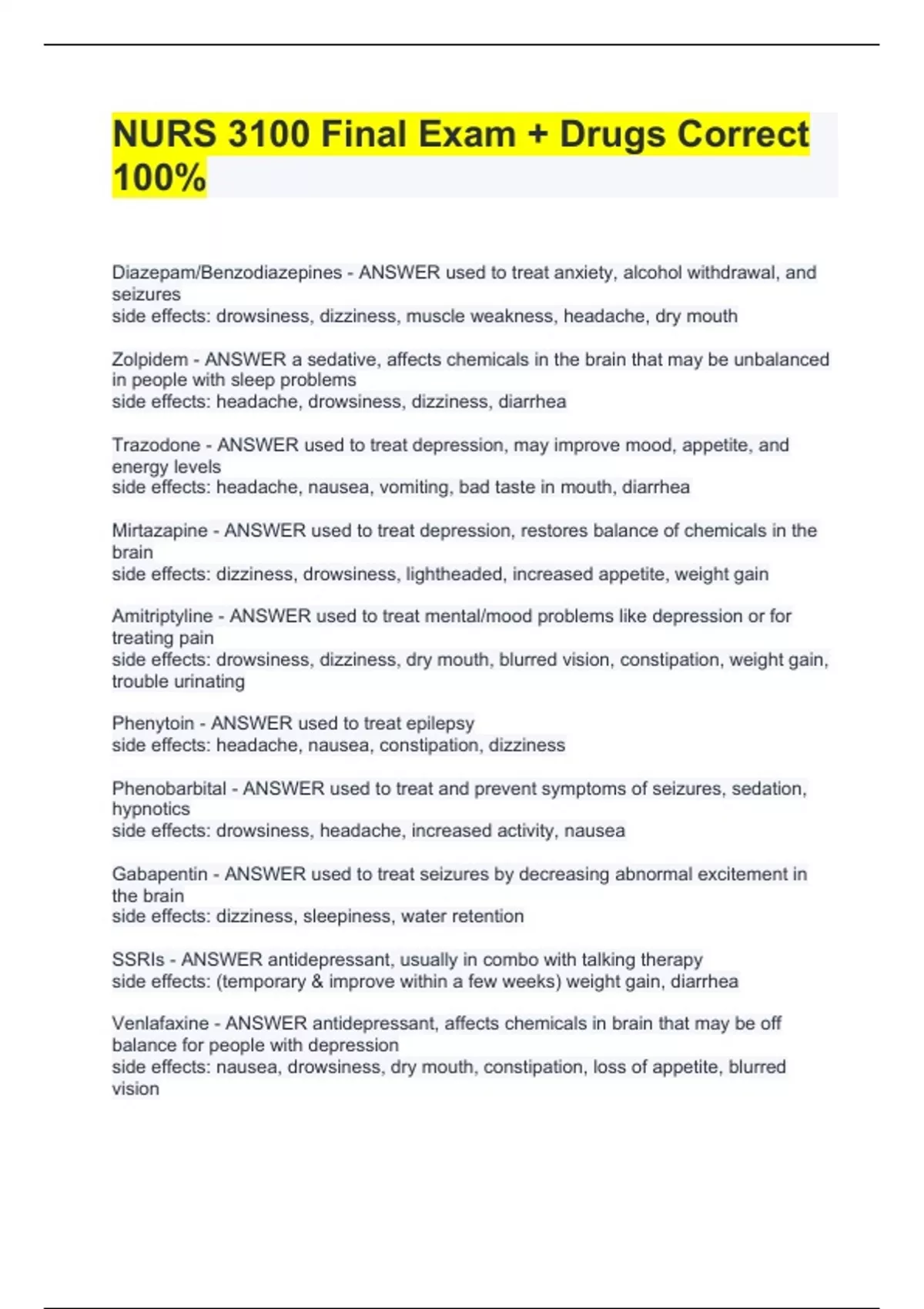 Diazepam/Benzodiazepines - ANSWER used to treat anxiety, alcohol withdrawal, and seizures side effects: drowsiness, dizziness, muscle weakness, headache, dry mouth Zolpidem - ANSWER a sedative, affects chemicals in the brain that may be unbalanced in people with sleep problems side effects: headache, drowsiness, dizziness, diarrhea Trazodone - ANSWER used to treat depression, may improve mood, appetite, and energy levels side effects: headache, nausea, vomiting, bad taste in mouth, diarrhea Mirtazapine - ANSWER used to treat depression, restores balance of chemicals in the brain side effects: dizziness, drowsiness, lightheaded, increased appetite, weight gain Amitriptyline - ANSWER used to treat mental/mood problems like depression or for treating pain side effects: drowsiness, dizziness, dry mouth, blurred vision, constipation, weight gain, trouble urinating Phenytoin - ANSWER used to treat epilepsy side effects: headache, nausea, constipation, dizziness Phenobarbital - ANSWER used to treat and p