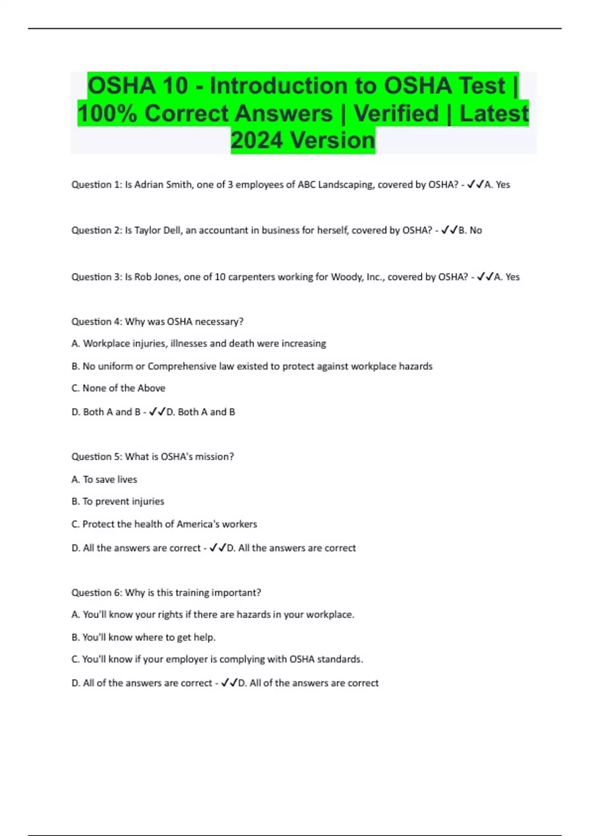 OSHA 10 - Introduction to OSHA Test | 100% Correct Answers | Verified | Latest 2024 Version