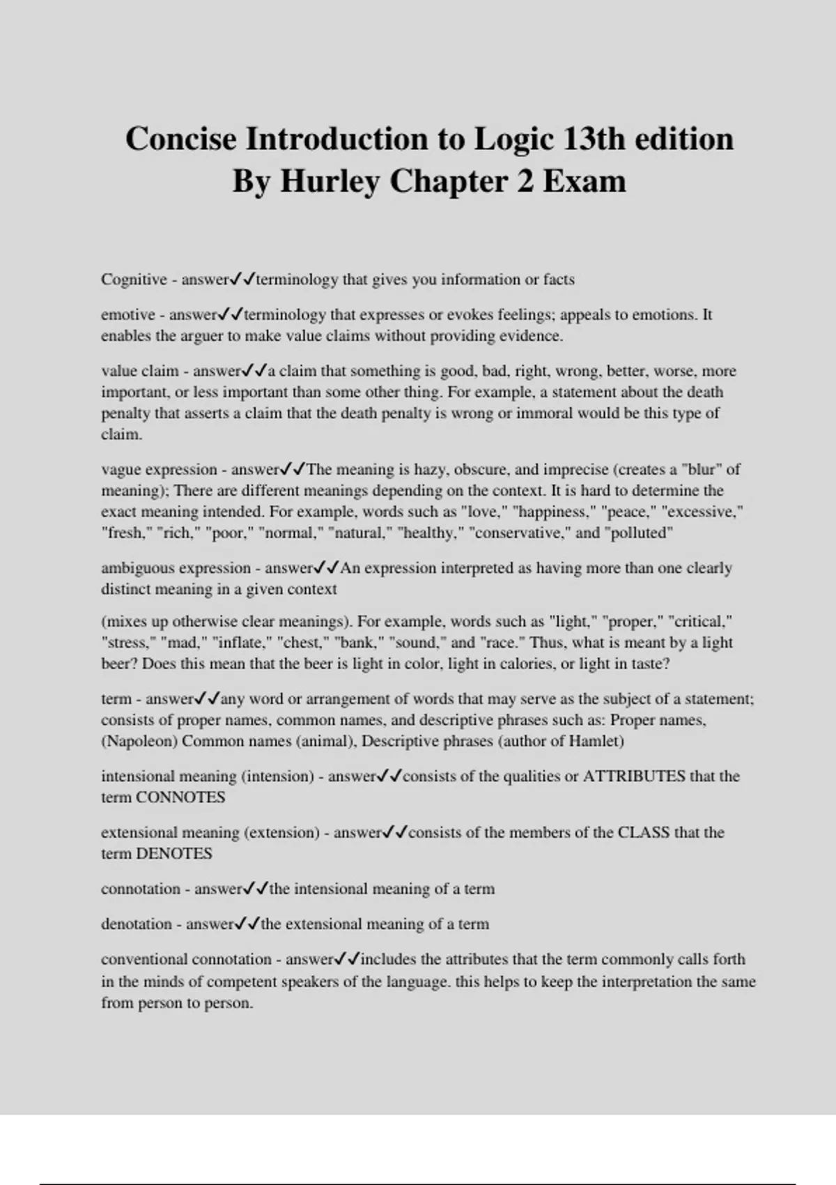 Concise Introduction to Logic 13th edition By Hurley Chapter 2 Exam Cognitive - answerterminology that gives you information or facts emotive - answerterminology that expresses or evokes feelings; appeals to emotions. It enables the arguer to make value claims without providing evidence. value claim - answera claim that something is good, bad, right, wrong, better, worse, more important, or less important than some other thing. For example, a statement about the death penalty that asserts a claim that the death penalty is wrong or immoral would be this type of claim. vague expression - answerThe meaning is hazy, obscure, and imprecise (creates a "blur" of meaning); There are different meanings depending on the context. It is hard to determine the exact meaning intended. For example, words such as "love," "happiness," "peace," "excessive," "fresh," "rich," "poor," "normal," "natural," "healthy," "conservative," and "polluted" ambiguous expression - answerAn expression interpreted as having more than one clearly distinct meaning in a given context (mixes up otherwise clear meanings). For example, words such as "light," "proper," "critical," "stress," "mad," "inflate," "chest," "bank," "sound," and "race." Thus, what is meant by a light beer? Does this mean that the beer is light in color, light in calories, or light in taste? term - answerany word or arrangement of words that may serve as the subject of a statement; consists of proper names, common names, and descriptive phrases such as: Proper names, (Napoleon) Common names (animal), Descriptive phrases (author of Hamlet) intensional meaning (intension) - answerconsists of the qualities or ATTRIBUTES that the term CONNOTES extensional meaning (extension) - answerconsists of the members of the CLASS that the term DENOTES connotation - answerthe intensional meaning of a term denotation - answerthe extensional meaning of a term conventional connotation - answerincludes the attributes that the term commonly calls forth in the minds of competent speakers of the langu