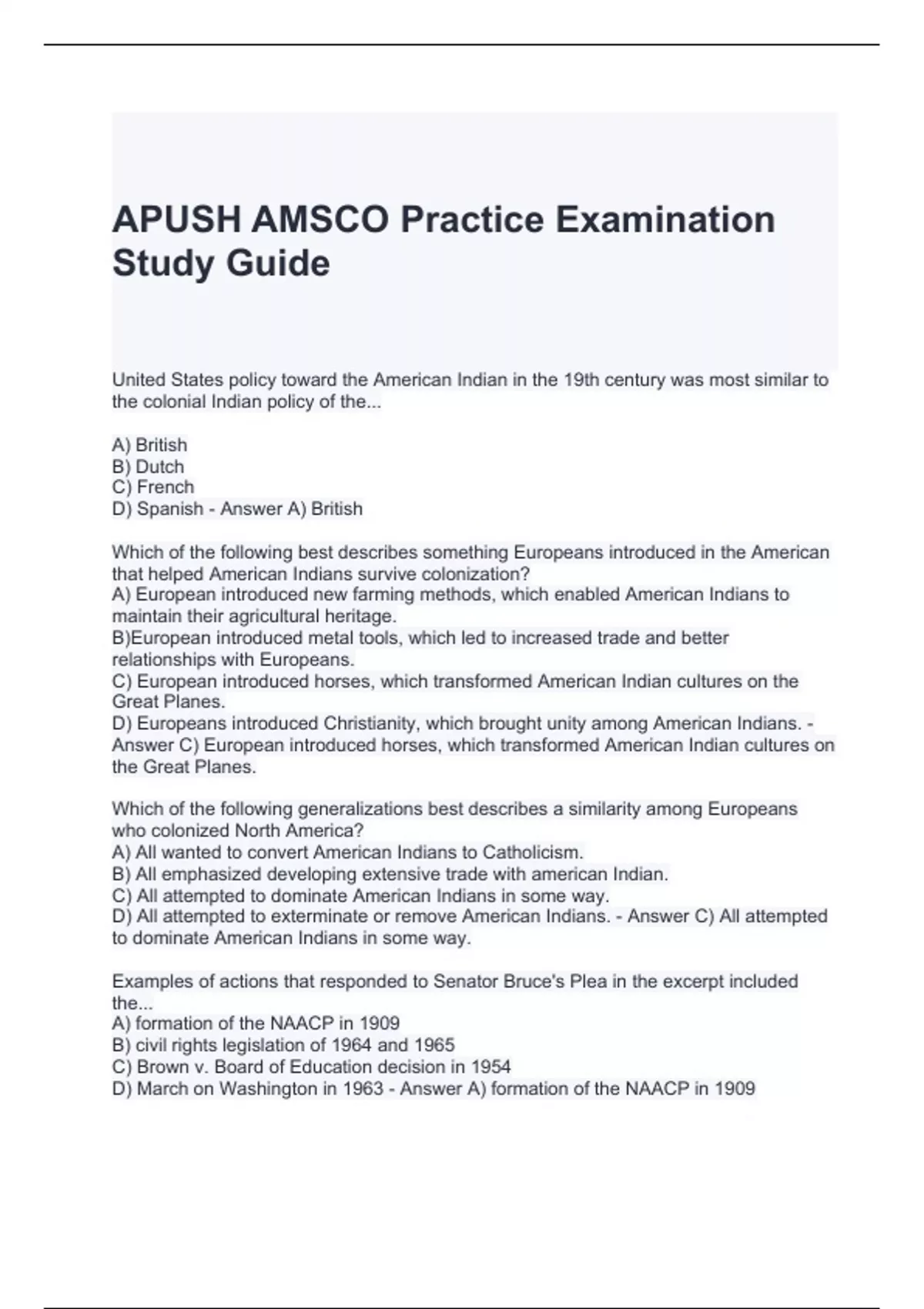 APUSH AMSCO Practice Examination Study Guide with complete solutions