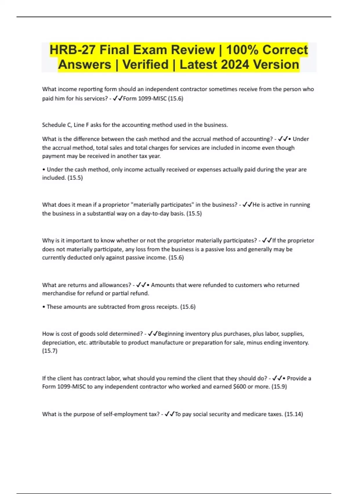 HRB-27 Final Exam Review | 100% Correct Answers | Verified | Latest 2024 Version What income reporting form should an independent contractor sometimes receive from the person who paid him for his services? - Form 1099-MISC (15.6) Schedule C, Line F asks for the accounting method used in the business. What is the difference between the cash method and the accrual method of accounting? - • Under the accrual method, total sales and total charges for services are included in income even though payment may be received in another tax year. • Under the cash method, only income actually received or expenses actually paid during the year are included. (15.5) What does it mean if a proprietor "materially participates" in the business? - He is active in running the business in a substantial way on a day-to-day basis. (15.5) Why is it important to know whether or not the proprietor materially participates? - If the proprietor does not materially participate, any loss from the business is a passive loss and generally may be currently deducted only against passive income. (15.6) What are returns and allowances? - • Amounts that were refunded to customers who returned merchandise for refund or partial refund. • These amounts are subtracted from gross receipts. (15.6) How is cost of goods sold determined? - Beginning inventory plus purchases, plus labor, supplies, depreciation, etc. attributable to product manufacture or preparation for sale, minus ending inventory. (15.7) If the client has contract labor, what should you remind the client that they should do? - • Provide a Form 1099-MISC to any independent contractor who worked and earned $600 or more. (15.9) What is the purpose of self-employment tax? - To pay social security and medicare taxes. (15.14) What amounts does a proprietor have "at risk"? - Amounts invested in the business plus any business debts for which the proprietor is personally liable. (15.16) What difference does it make if the proprietor is "at risk" or not? - Only amounts at risk may be used to determine the actual loss on Schedule C. (15.16) How does a Tax Professional meet due diligence requirements? - • Tax Professionals fulfill due diligence requirements by making every effort to prepare accurate and complete returns. • Tax Professionals must have knowledge of tax law, and apply a reasonability check to the information provided by their clients. (26.1) What is a thorough interview? - A thorough interview consists of asking general information questions, then asking additional questions whenever information is incomplete or seems inaccurate or inconsistent. (26.2) What is a conflict of interest? - A conflict of interest is when one's situation might benefit at the expense of another's situation. (26.3) What actions can resolve a conflict of interest? - A conflict of interest is resolved when it is acknowledged, disclosed to all parties, and the parties have consented to waiving the conflict. (26.3) What client information is confidential? - Any information that could potentially identify the client is confidential. Information includes (but is not limited to): • Name • Address and phone number • Social security numbers • Place of employment • Any information from a tax return (26.4)