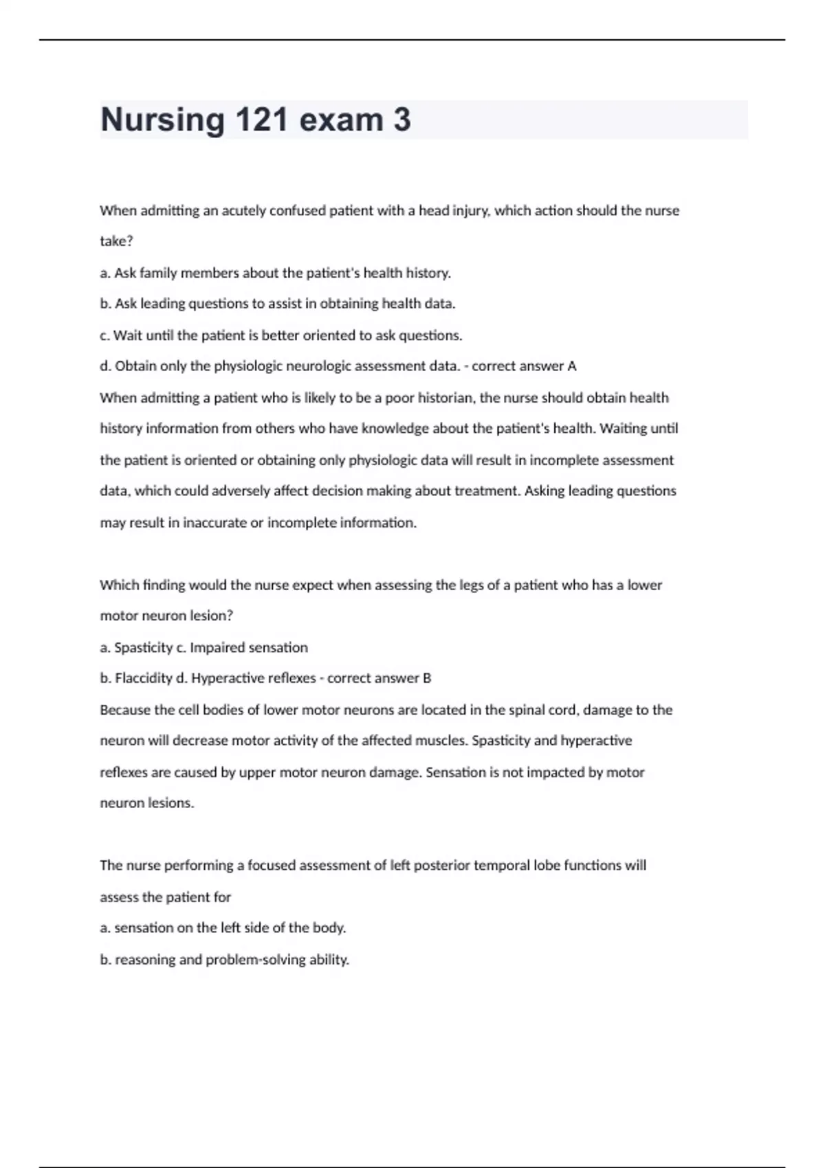 Nursing 121 exam 3When admitting an acutely confused patient with a head injury, which action should the nurse take? a. Ask family members about the patient's health history. b. Ask leading questions to assist in obtaining health data. c. Wait until the patient is better oriented to ask questions. d. Obtain only the physiologic neurologic assessment data. - correct answer A When admitting a patient who is likely to be a poor historian, the nurse should obtain health history information from others who have knowledge about the patient's health. Waiting until the patient is oriented or obtaining only physiologic data will result in incomplete assessment data, which could adversely affect decision making about treatment. Asking leading questions may result in inaccurate or incomplete information. Which finding would the nurse expect when assessing the legs of a patient who has a lower motor neuron lesion? a. Spasticity c. Impaired sensation b. Flaccidity d. Hyperactive reflexes - correct answer B Because the cell bodies of lower motor neurons are located in the spinal cord, damage to the neuron will decrease motor activity of the affected muscles. Spasticity and hyperactive reflexes are caused by upper motor neuron damage. Sensation is not impacted by motor neuron lesions. The nurse performing a focused assessment of left posterior temporal lobe functions will assess the patient for a. sensation on the left side of the body. b. reasoning and problem-solving ability.