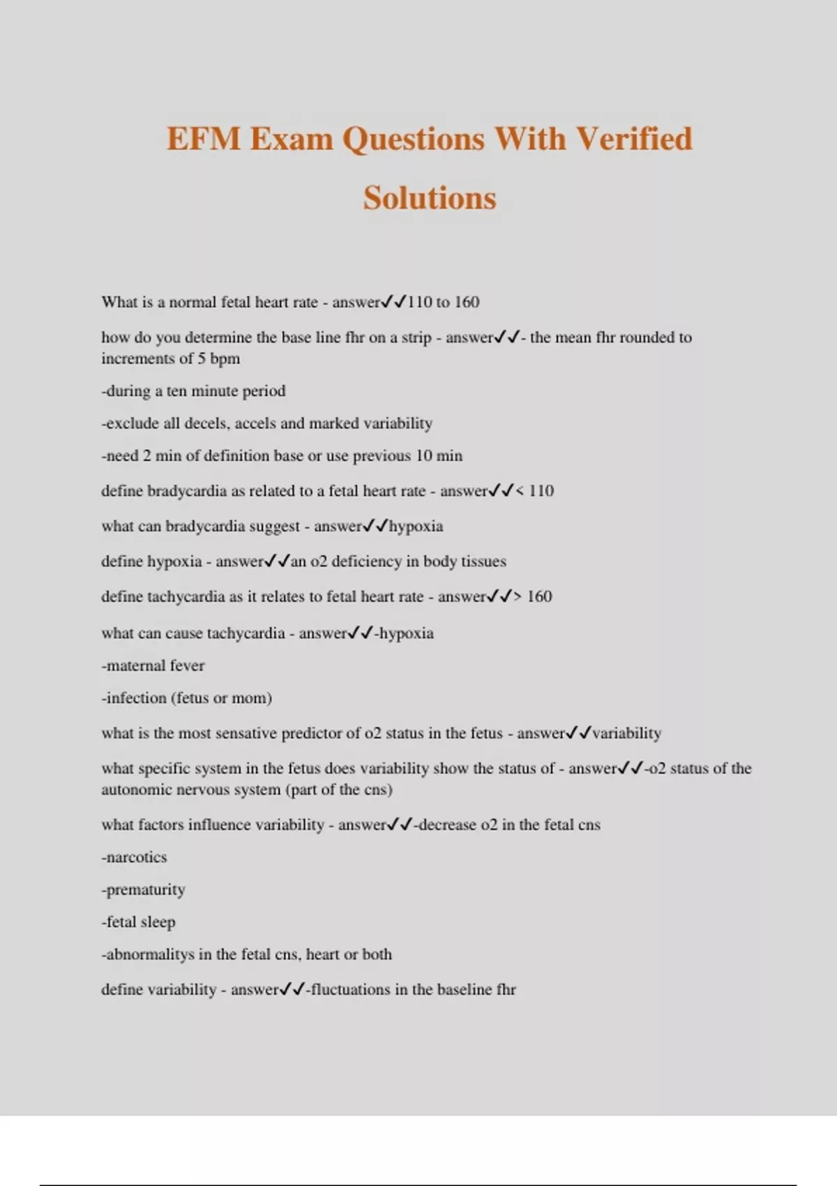 EFM Exam Questions With Verified Solutions What is a normal fetal heart rate - answer110 to 160 how do you determine the base line fhr on a strip - answer- the mean fhr rounded to increments of 5 bpm -during a ten minute period -exclude all decels, accels and marked variability -need 2 min of definition base or use previous 10 min define bradycardia as related to a fetal heart rate - answer 110 what can bradycardia suggest - answerhypoxia define hypoxia - answeran o2 deficiency in body tissues define tachycardia as it relates to fetal heart rate - answer 160 what can cause tachycardia - answer-hypoxia -maternal fever -infection (fetus or mom) what is the most sensative predictor of o2 status in the fetus - answervariability what specific system in the fetus does variability show the status of - answer-o2 status of the autonomic nervous system (part of the cns) what factors influence variability - answer-decrease o2 in the fetal cns -narcotics -prematurity -fetal sleep -abnormalitys in the fetal cns, heart or both define variability - answer-fluctuations in the baseline fhr