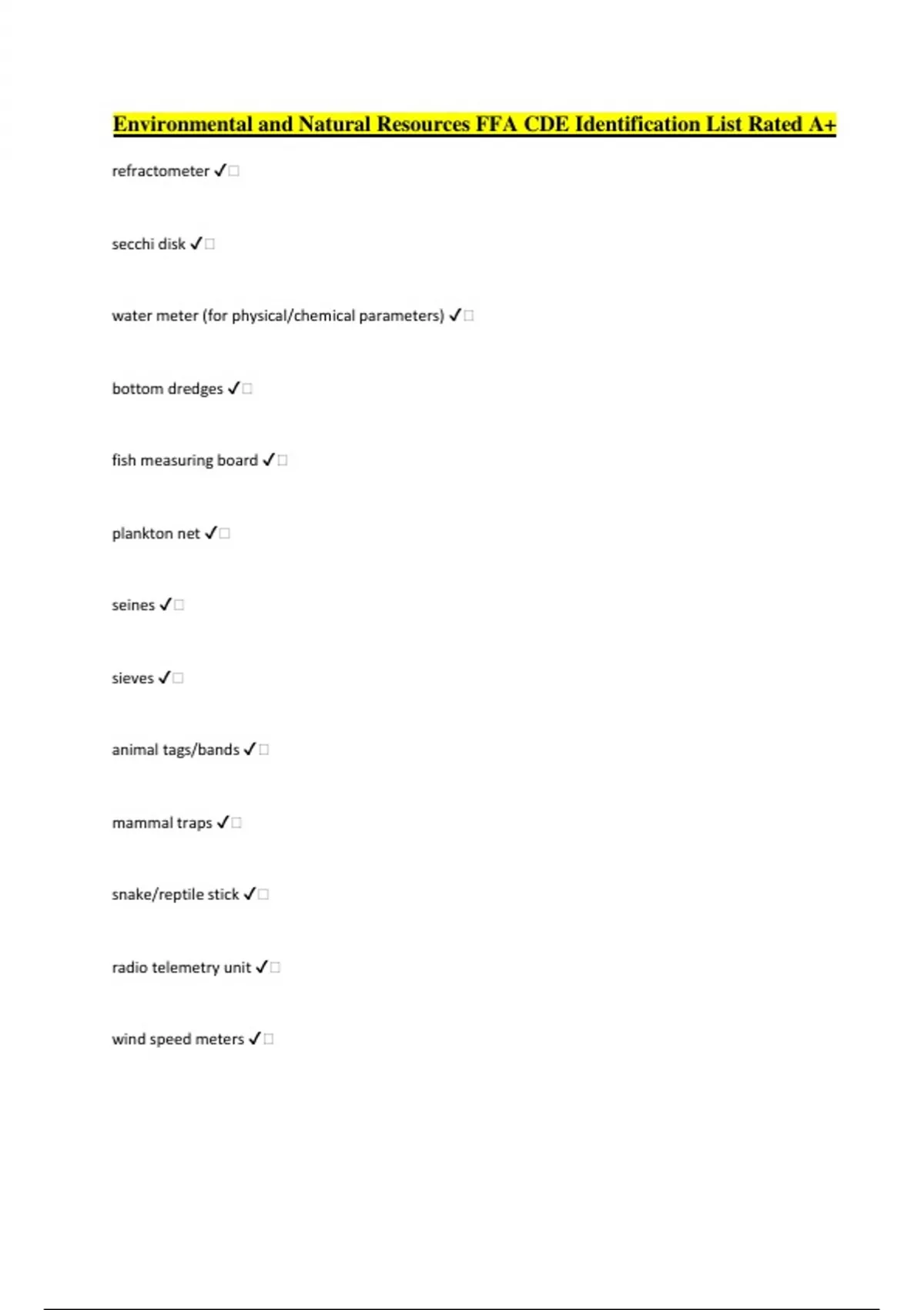 Environmental and Natural Resources FFA CDE Identification List Rated A+ refractometer ️ secchi disk ️ water meter (for physical/chemical parameters) ️ bottom dredges ️ fish measuring board ️ plankton net ️ seines ️ sieves ️ animal tags/bands ️ mammal traps ️ snake/reptile stick ️ radio telemetry unit ️ wind speed meters ️ barometer ️ abny level ️ push probe ️ soil auger ️ soil color book ️ armadillo ️ badger ️ beaver ️ bighorn sheep ️ bison ️ black bear ️ blacktail deer ️ bobcat ️ chipmunk ️ cottontail ️ coyote ️ elk ️ fox squirrel ️ gray squirrel ️ gray wolf ️ grizzly bear ️ jack rabbit ️ mole ️ moose ️ mountain goat ️ mountain lion ️ mule deer ️ muskrat ️ opossum ️ pocket gopher ️ porcupine ️ prairie dog ️ Pronghorn ️ raccoon ️ red fox ️ skunk ️ weasel ️ whitetail deer ️ woodchuck ️ bald eagle ️ blue jay ️ bluebird ️ brown thrasher ️