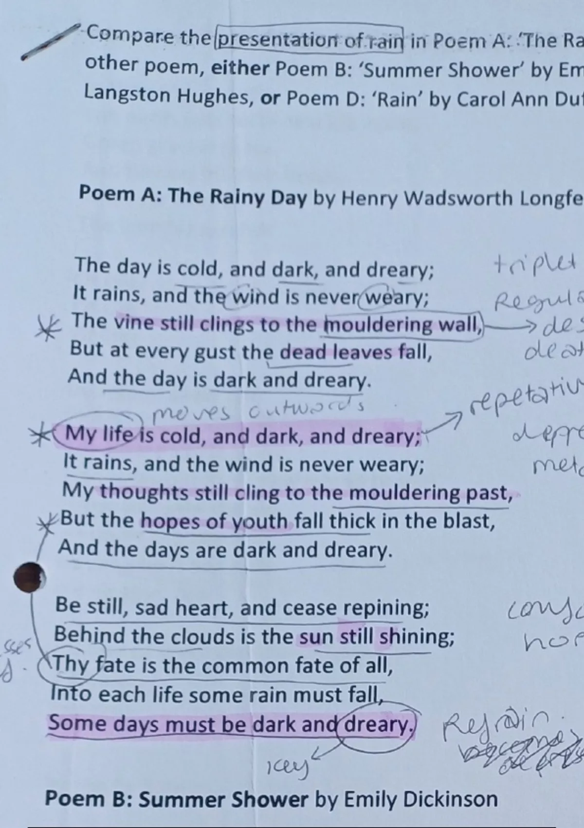 Unseen Poetry Comparison Essay on the presentation of Rain: 'The Rainy Day' by Henry Wadsworth Longfellow and 'Rain' by Carol Ann Duffy