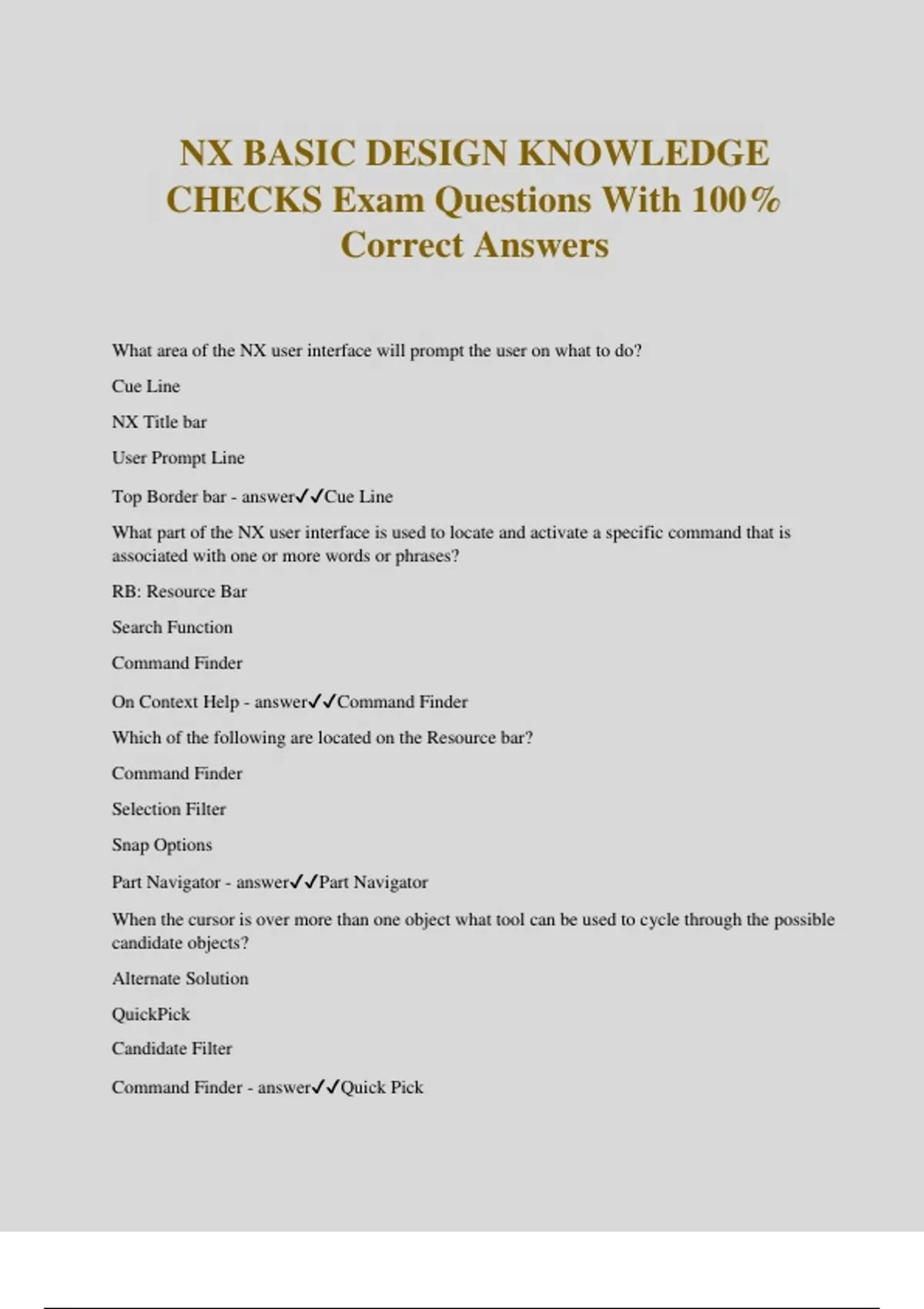 NX BASIC DESIGN KNOWLEDGE CHECKS Exam Questions With 100% Correct Answers What area of the NX user interface will prompt the user on what to do? Cue Line NX Title bar User Prompt Line Top Border bar - answerCue Line What part of the NX user interface is used to locate and activate a specific command that is associated with one or more words or phrases? RB: Resource Bar Search Function Command Finder On Context Help - answerCommand Finder Which of the following are located on the Resource bar? Command Finder Selection Filter Snap Options Part Navigator - answerPart Navigator When the cursor is over more than one object what tool can be used to cycle through the possible candidate objects? Alternate Solution QuickPick Candidate Filter Command Finder - answerQuick Pick In the NX user interface, the availability and layout of commands are organized by what to support the different major workflows? Tool groups Applications Tool Bars Tool GalleriesRV: Layer - answerApplications What do the Roles control? The background color of a part What application you are in The buttons displayed in the ribbon groups The permission of the part file - answerThe buttons displayed in the ribbon groups If you don't see the commands you want to use what is one way to display them? Change your role Use the Show and Hide command Press the Home key Use Full Screen display - answerchange your role You find a command with the Command Finder that is not currently displayed on the Ribbon bar. How can you start the command? Select the indicated role in the Command Finder Use the menu to access the command Add the command to the Ribbon bar first Click the command in Command Finder - answerclick the command finder The Roles Tab is located on the _____? Ribbon Bar Resource Bar Top Border Bar Que Line - answerresource bar When creating an Offset - Datum CSYS what type of Reference CSYS must be used to establish associativity to an existing Datum Coordinate System?