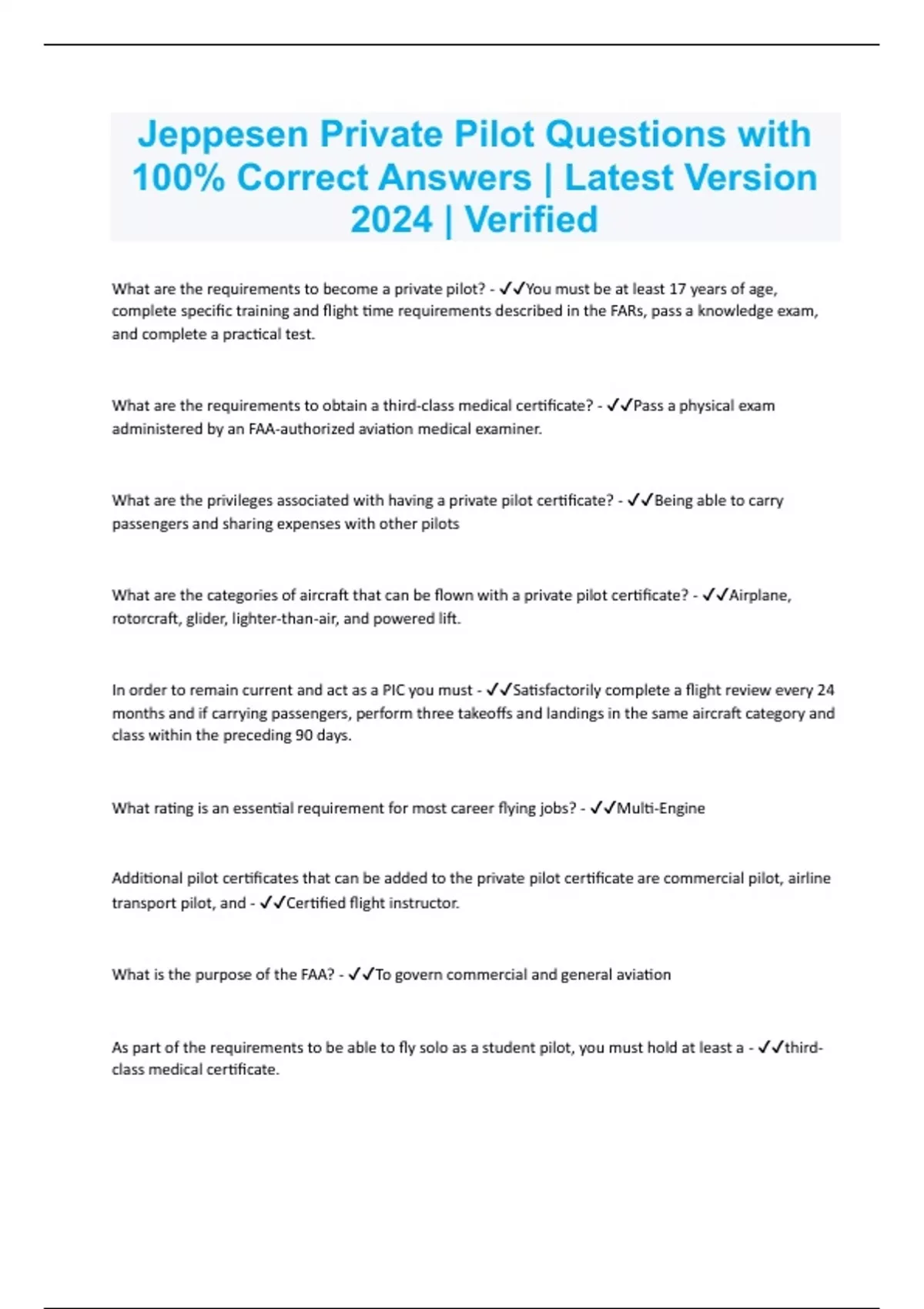 Jeppesen Private Pilot Questions with 100% Correct Answers | Latest Version 2024 | Verified What are the requirements to become a private pilot? - You must be at least 17 years of age, complete specific training and flight time requirements described in the FARs, pass a knowledge exam, and complete a practical test. What are the requirements to obtain a third-class medical certificate? - Pass a physical exam administered by an FAA-authorized aviation medical examiner. What are the privileges associated with having a private pilot certificate? - Being able to carry passengers and sharing expenses with other pilots What are the categories of aircraft that can be flown with a private pilot certificate? - Airplane, rotorcraft, glider, lighter-than-air, and powered lift. In order to remain current and act as a PIC you must - Satisfactorily complete a flight review every 24 months and if carrying passengers, perform three takeoffs and landings in the same aircraft category and class within the preceding 90 days. What rating is an essential requirement for most career flying jobs? - Multi-Engine Additional pilot certificates that can be added to the private pilot certificate are commercial pilot, airline transport pilot, and - Certified flight instructor. What is the purpose of the FAA? - To govern commercial and general aviation As part of the requirements to be able to fly solo as a student pilot, you must hold at least a - third- class medical certificate. How do variations in the atmospheric pressure affect your body when flying? - Reduced pressure can cause pain in the ears, sinuses, and abdomen and can cause decompression sickness after scuba diving. What are four ways to minimize the effects of motion sickness? - Reduce stress and anxiety; schedule flights to avoid turbulent conditions; focus on objects outside the aircraft; open fresh air vents How does fatigue affect pilot performance? - Degrades concentration, impairs coordination, and decreases the ability to communicate How can alcohol impair your ability to control your airplane? - It reduces coordination, slows reflexes, and impairs vision. If you are using a drug, what process should you follow before flying? - Perform a self-assessment, obtain an aviation medical examiner's approval, and verify FAA approval of the drug. What actions do you need to take to plan for practicing flight maneuvers and procedures? - Determine and appropriate altitude and location for practice; determine the maneuver and procedure steps and appropriate airplane configurations using the pilot's operating handbook (POH) and your training materials. What are steps in the positive exchange of flight controls procedure? - 1. The pilot passing the control says, "You have the flight controls," and continues to fly the airplane. 2. The pilot taking control says, "I have the flight control," and moves the control stick to confirm. 3. The pilot passing the control says, "You have the flight controls," releases the flight controls, and visually verifies that the other pilot has the flight controls. What are the elements of the passenger briefing that you should perform prior to the flight? - How and when to fasten safety belts, air vent location and operation, fire extinguisher location and operation, egress and emergency operation of doors and windows, traffic and talking including use of headsets, your questions (passenger questions) What are the elements of a takeoff briefing? - Wind direction and velocity, runway length and conditions, takeoff distance, initial heading, initial altitude, takeoff and climb speeds, departure procedures, emergency plan in case of an engine failure after takeoff, pilot and co-pilot responsibilities. What are the elements of before-landing briefing? - Airport information and weather conditions, active runway, terrain and obstacles, airport elevation