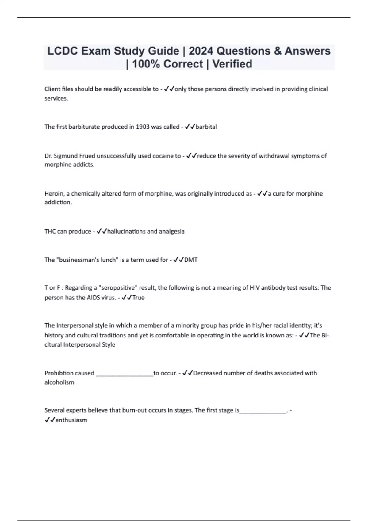 LCDC Exam Study Guide | 2024 Questions & Answers | 100% Correct | Verified Client files should be readily accessible to - only those persons directly involved in providing clinical services. The first barbiturate produced in 1903 was called - barbital Dr. Sigmund Frued unsuccessfully used cocaine to - reduce the severity of withdrawal symptoms of morphine addicts. Heroin, a chemically altered form of morphine, was originally introduced as - a cure for morphine addiction. THC can produce - hallucinations and analgesia The "businessman's lunch" is a term used for - DMT T or F : Regarding a "seropositive" result, the following is not a meaning of HIV antibody test results: The person has the AIDS virus. - True The Interpersonal style in which a member of a minority group has pride in his/her racial identity; it's history and cultural traditions and yet is comfortable in operating in the world is known as: - The Bi- cltural Interpersonal Style Prohibtion caused _________________to occur. - Decreased number of deaths associated with alcoholism Several experts believe that burn-out occurs in stages. The first stage is______________. - enthusiasm Pattern of drinking accurately associated with the term "alcoholism" - Inability to control the amount one drinks Metalbolic process that changes alcohol to the compound acetaldehyde - detoxification Frequent mistake that begining counselors make with clients - Failure to openly discuss each others expectations Metabolic process that leads to the formation of water and carbon dioxide by process of chemically heating acetic acid - oxidation Part of the brain that controls heart rate, hunger, body weight and arterial blood pressure - hypothalamus Style of counseling in which a counselor is aware of his/her fears and dislikes for a minority culture but hides those fears beneath the surface of counseling - Covert (Hidden) Prejudice T or F: Failure to react to the problem is not an adjustment the family makes to the problem of chemical dependency. - True Neurotransmitter associated with arousal and mood - norepinephrine Functional and structural unit of the nervous system - neuron If an anti-ulcer medicine tends to increase blood alcohol levels and thus makes drinkers more intoxicated, this type of drug interaction would be best described as _____________. - potentiating Five Critical Components of Effective Treatment - Assessment, Patient-treatment matching, Comprehensive services, Relapse prevention and Accountability of the treatment program The medical view of addiction understands that addicted persons have a ________________. - treatable disease Addiction is a __________ disorder that is prone to