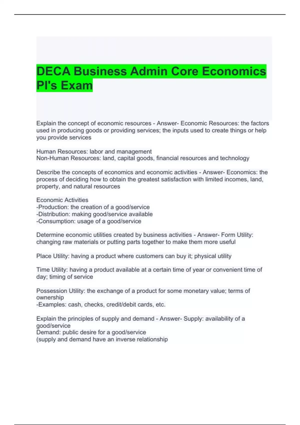 DECA Business Admin Core Economics PI's Exam with 100% correct Answers