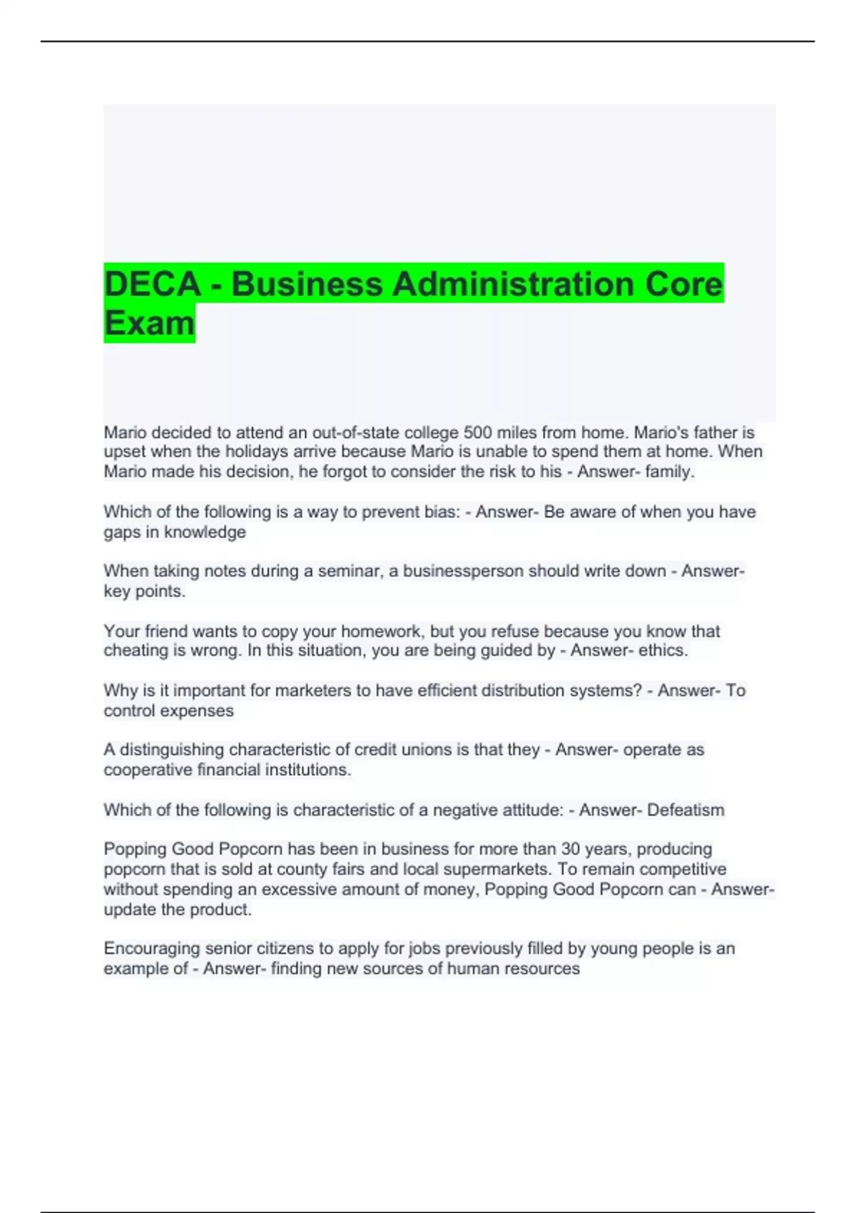 DECA - Business Administration Core Exam with correct Answers
