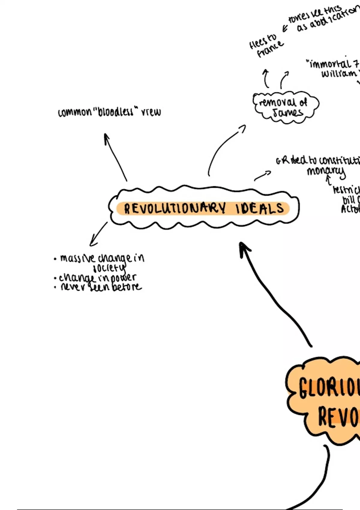 This pack contains PDFs with four mind maps, each focusing on a significant topic. The first map covers the Glorious Revolution, highlighting key dates, acts passed, revolutionary ideals, an assessment of its revolutionary nature, and the causes of the revolution. The second map delves into the Toleration Act of 1689 and Anglican Supremacy. The third explores the Triennial Act of 1694 and the expansion of parliamentary power. The final map examines William's Wars and the Financial Revolution. Each mind map is detailed with mini-themes, dates, and events based on textbook content and external readings.