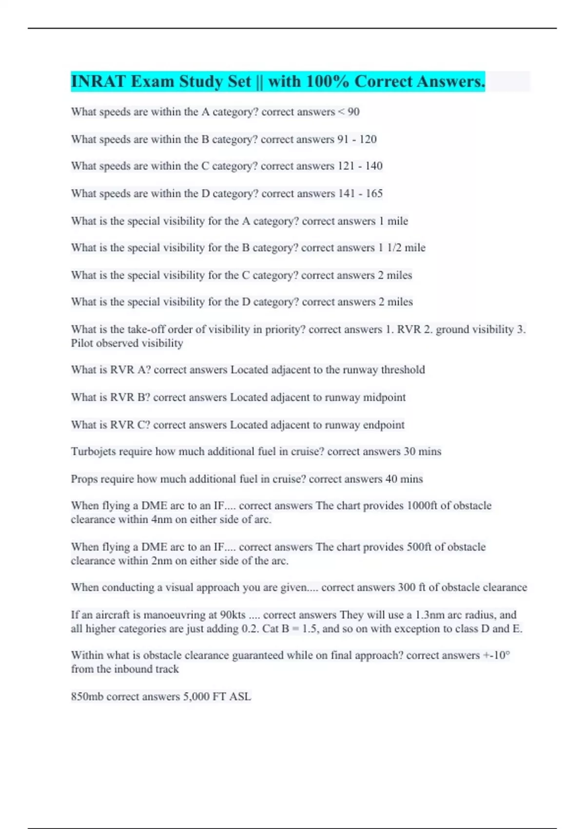 What speeds are within the A category? correct answers 90 What speeds are within the B category? correct answers 91 - 120 What speeds are within the C category? correct answers 121 - 140 What speeds are within the D category? correct answers 141 - 165 What is the special visibility for the A category? correct answers 1 mile What is the special visibility for the B category? correct answers 1 1/2 mile What is the special visibility for the C category? correct answers 2 miles What is the special visibility for the D category? correct answers 2 miles What is the take-off order of visibility in priority? correct answers 1. RVR 2. ground visibility 3. Pilot observed visibility What is RVR A? correct answers Located adjacent to the runway threshold What is RVR B? correct answers Located adjacent to runway midpoint What is RVR C? correct answers Located adjacent to runway endpoint Turbojets require how much additional fuel in cruise? correct answers 30 mins Props require how much additional fuel in cruise? correct answers 40 mins When flying a DME arc to an IF.... correct answers The chart provides 1000ft of obstacle clearance within 4nm on either side of arc. When flying a DME arc to an IF.... correct answers The chart provides 500ft of obstacle clearance within 2nm on either side of the arc. When conducting a visual approach you are given.... correct answers 300 ft of obstacle clearance If an aircraft is manoeuvring at 90kts .... correct answers They will use a 1.3nm arc radius, and all higher categories are just adding 0.2. Cat B = 1.5, and so on with exception to class D and E. Within what is obstacle clearance guaranteed while on final approach? correct answers +-10° from the inbound track 850mb correct answers 5,000 FT ASL