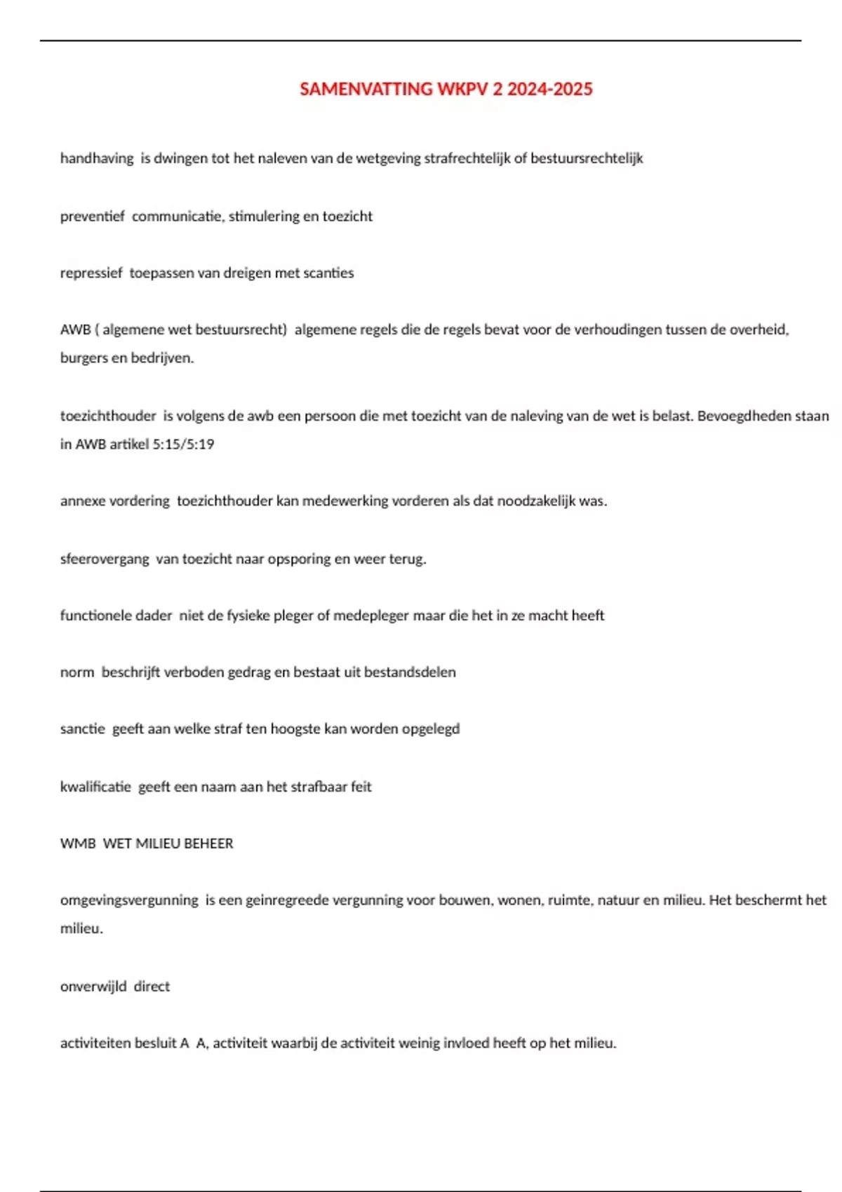 SAMENVATTING WKPV handhaving is dwingen tot het naleven van de wetgeving strafrechtelijk of bestuursrechtelijk preventief communicatie, stimulering en toezicht repressief toepassen van dreigen met scanties AWB ( algemene wet bestuursrecht) algemene regels die de regels bevat voor de verhoudingen tussen de overheid, burgers en bedrijven. toezichthouder is volgens de awb een persoon die met toezicht van de naleving van de wet is belast. Bevoegdheden staan in AWB artikel 5:15/5:19 annexe vordering toezichthouder kan medewerking vorderen als dat noodzakelijk was. sfeerovergang van toezicht naar opsporing en weer terug. functionele dader niet de fysieke pleger of medepleger maar die het in ze macht heeft norm beschrijft verboden gedrag en bestaat uit bestandsdelen sanctie geeft aan welke straf ten hoogste kan worden opgelegd kwalificatie geeft een naam aan het strafbaar feit WMB WET MILIEU BEHEER omgevingsvergunning is een geinregreede vergunning voor bouwen, wonen, ruimte, natuur en milieu. Het beschermt het milieu. onverwijld direct activiteiten besluit A A, activiteit waarbij de activiteit weinig invloed heeft op het milieu.