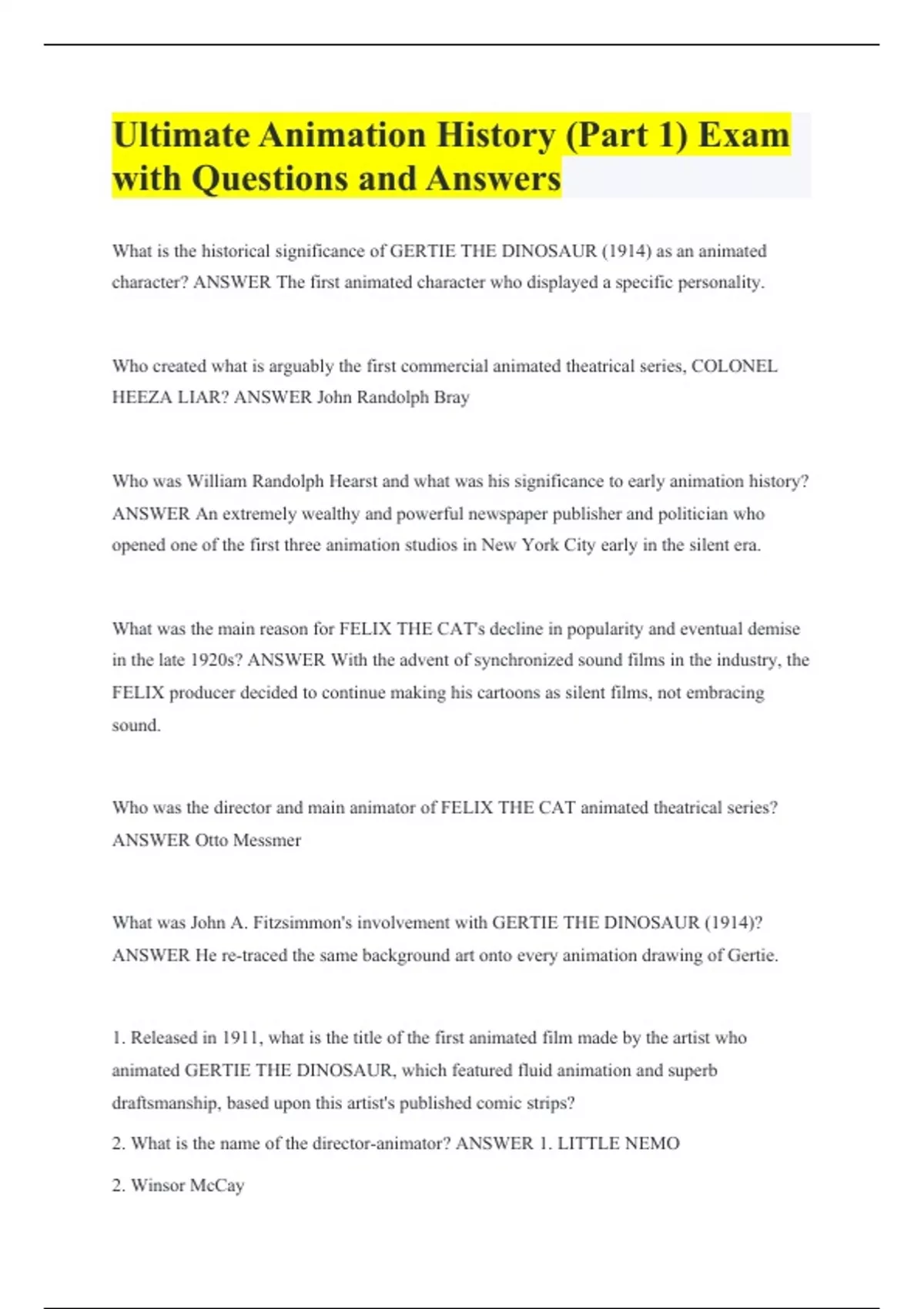 Ultimate Animation History (Part 1) Exam with Questions and Answers What is the historical significance of GERTIE THE DINOSAUR (1914) as an animated character? ANSWER The first animated character who displayed a specific personality. Who created what is arguably the first commercial animated theatrical series, COLONEL HEEZA LIAR? ANSWER John Randolph Bray Who was William Randolph Hearst and what was his significance to early animation history? ANSWER An extremely wealthy and powerful newspaper publisher and politician who opened one of the first three animation studios in New York City early in the silent era. What was the main reason for FELIX THE CAT's decline in popularity and eventual demise in the late 1920s? ANSWER With the advent of synchronized sound films in the industry, the FELIX producer decided to continue making his cartoons as silent films, not embracing sound. Who was the director and main animator of FELIX THE CAT animated theatrical series? ANSWER Otto Messmer What was John A. Fitzsimmon's involvement with GERTIE THE DINOSAUR (1914)? ANSWER He re-traced the same background art onto every animation drawing of Gertie. 1. Released in 1911, what is the title of the first animated film made by the artist who animated GERTIE THE DINOSAUR, which featured fluid animation and superb draftsmanship, based upon this artist's published comic strips? 2. What is the name of the director-animator? ANSWER 1. LITTLE NEMO 2. Winsor McCay